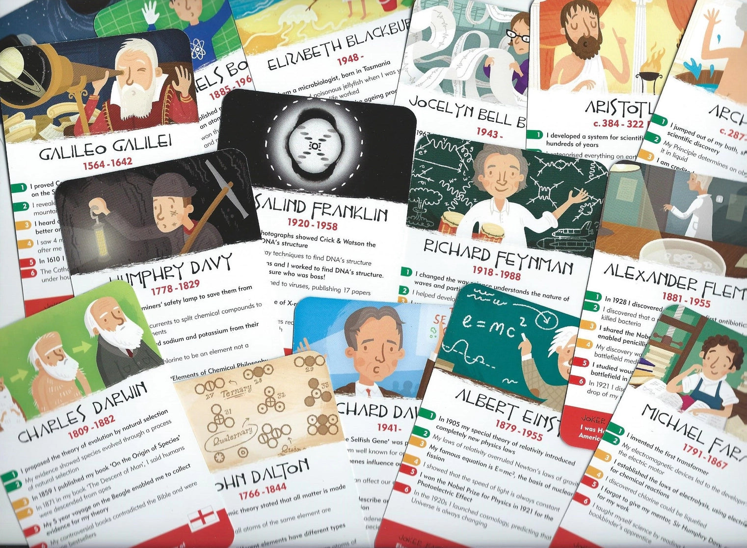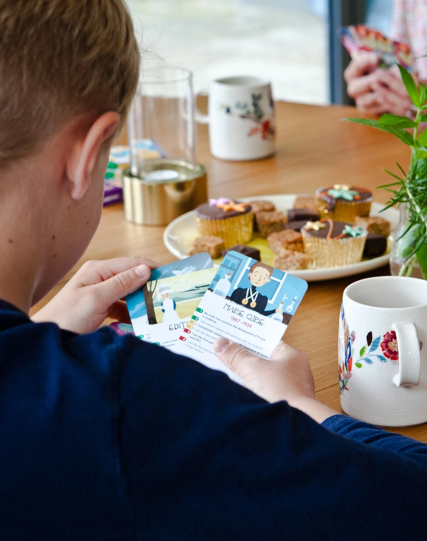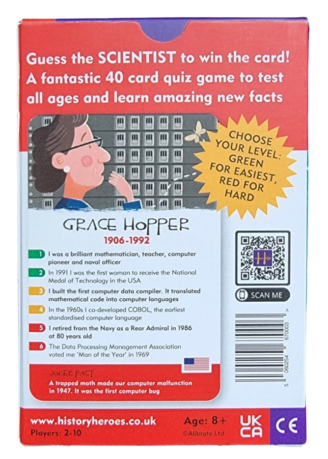 Win the cards by guessing who the scientists are from the facts on their fantastically illustrated cards Know your Copernicus from your Marie Curie and your Galileo from your Grace Hopper! Choose your level of fact from green to red, easiest to hard or entertain each other with each card's Joker fact about each scientists.