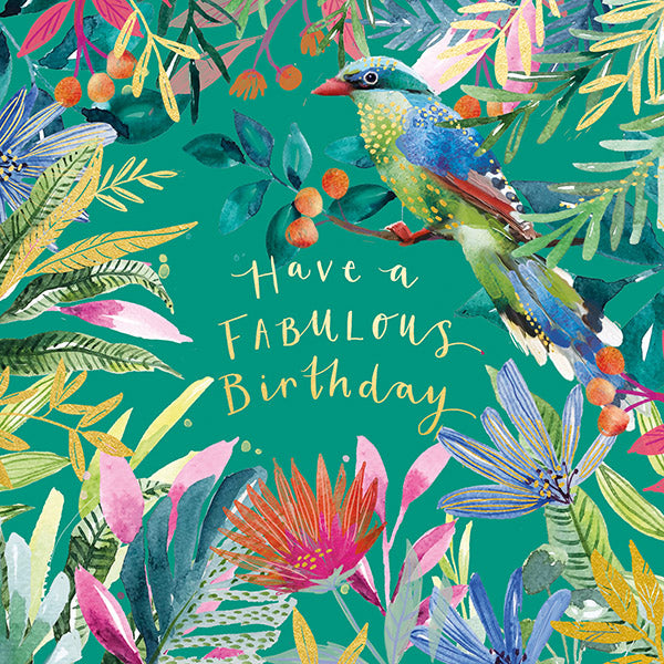 This card features colourful tropical foliage and an exotic bird, with "have a fabulous birthday" written in the centre gold foil on a green background.