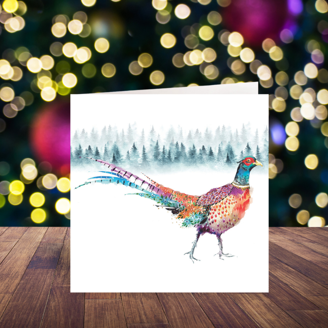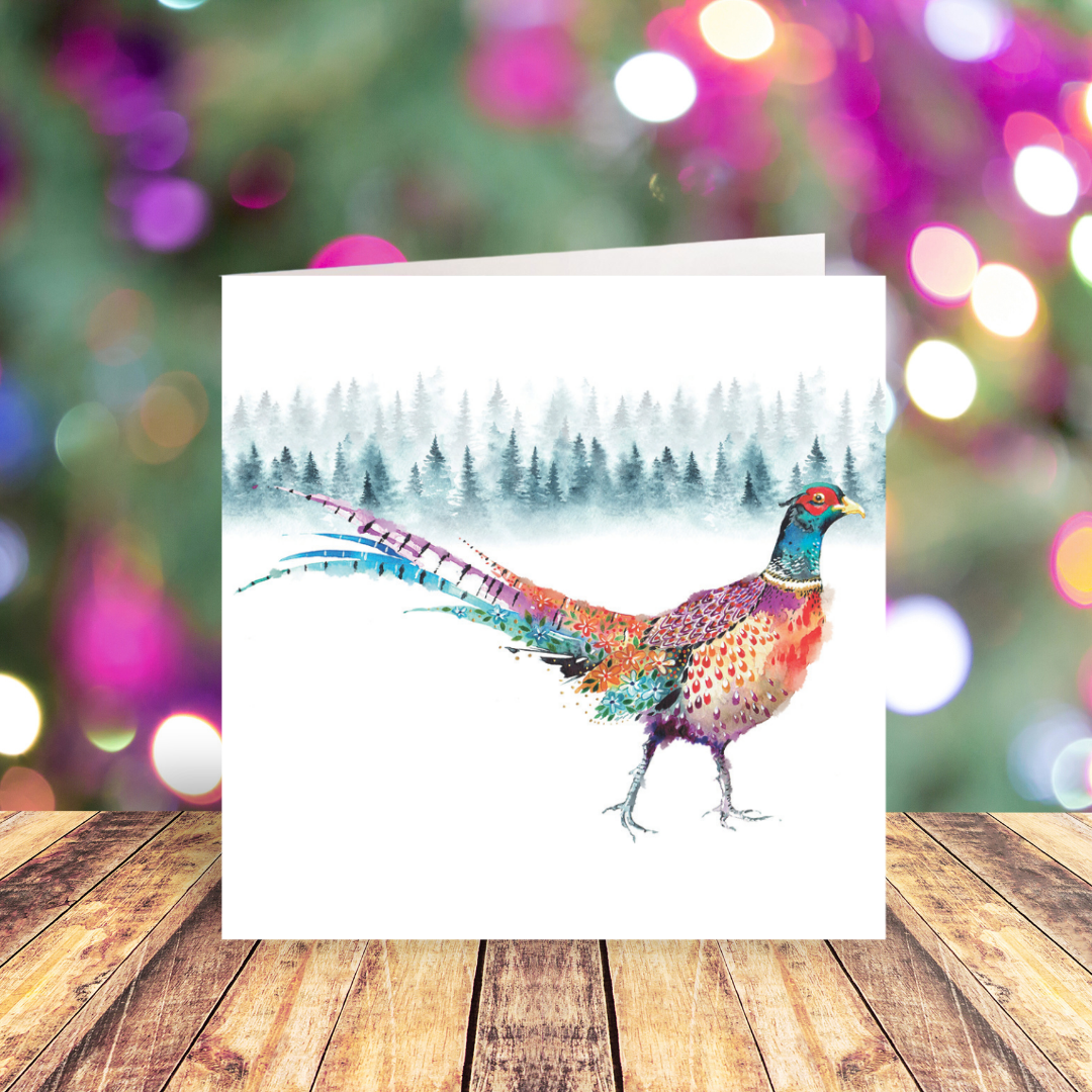 This pack of cards features a beautiful watercolour pheasant on a white background, tall watercolour trees appear to be shrouded in fog in the distance.