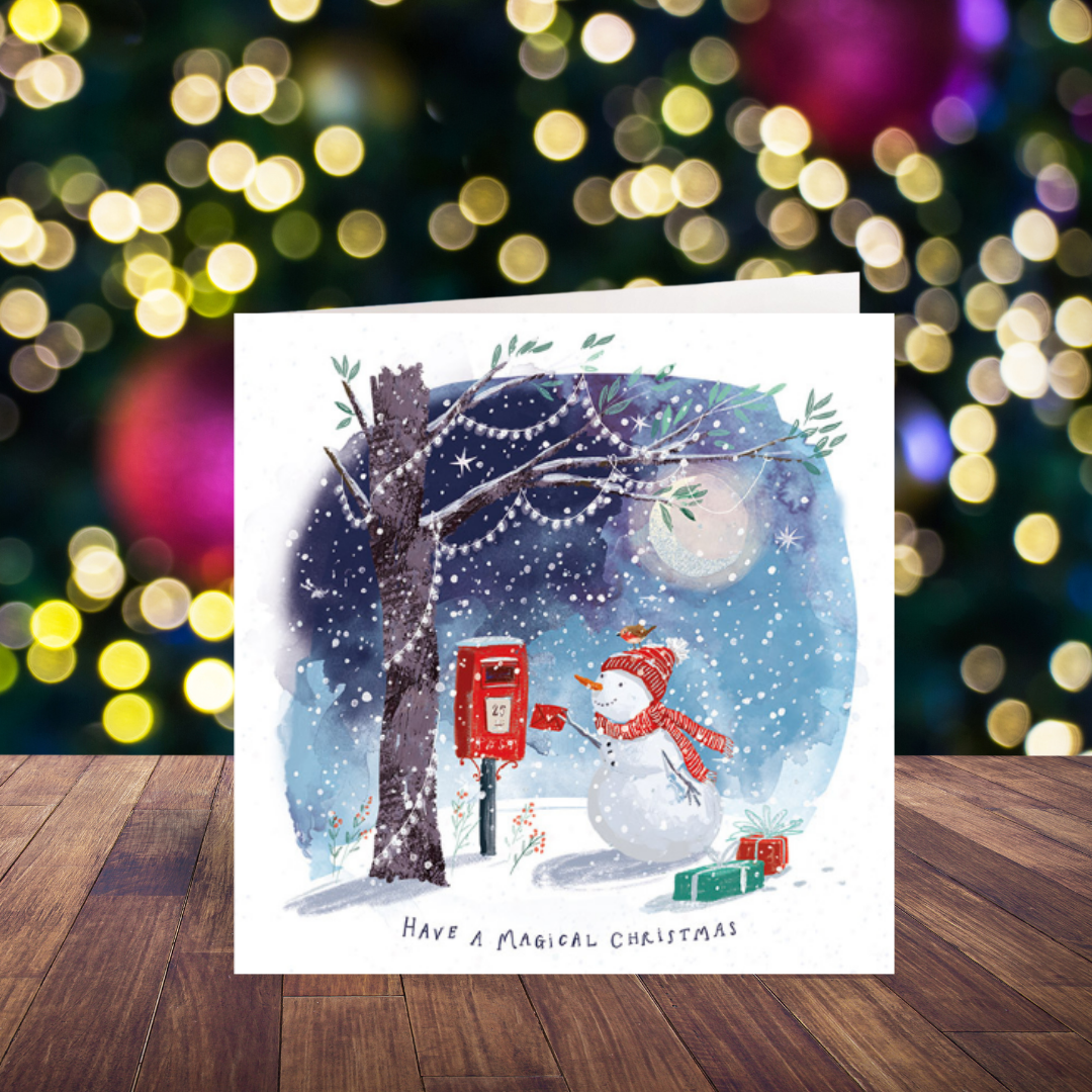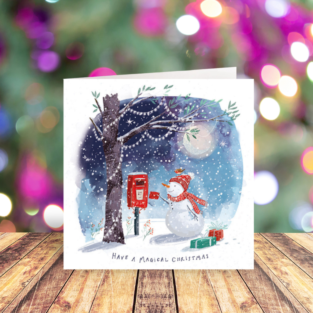 This pack of cards feature a watercolour snowy night time scene on a white background. The moon shines above a snowman in a red knitted hat and scarf. A robin is perched on his hat as he posts a letter in a red post box, two Christmas presents beside him. A tree stands next to the post box with fairy lights wrapped around it. Silver foil details make the card sparkle.Inside the card a printed message reads "With Best Wishes for Christmas and the New Year".