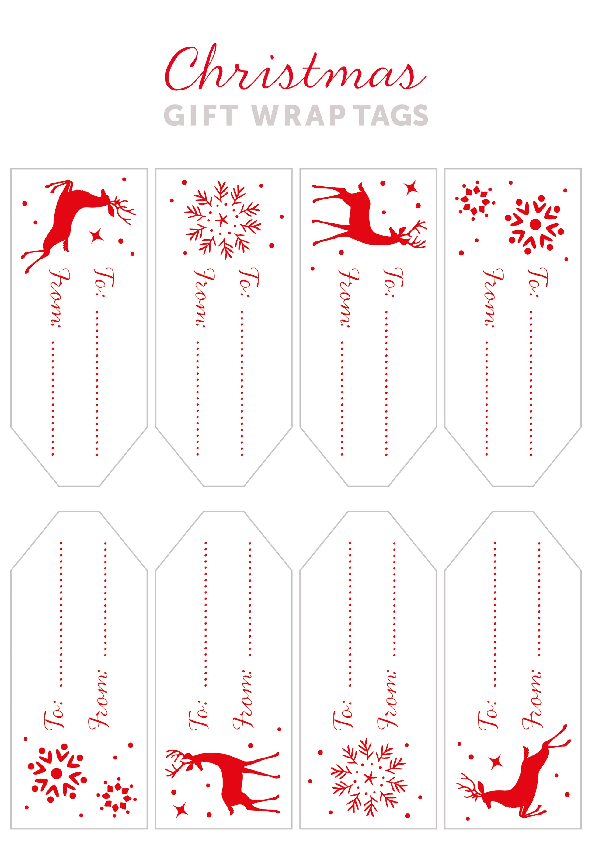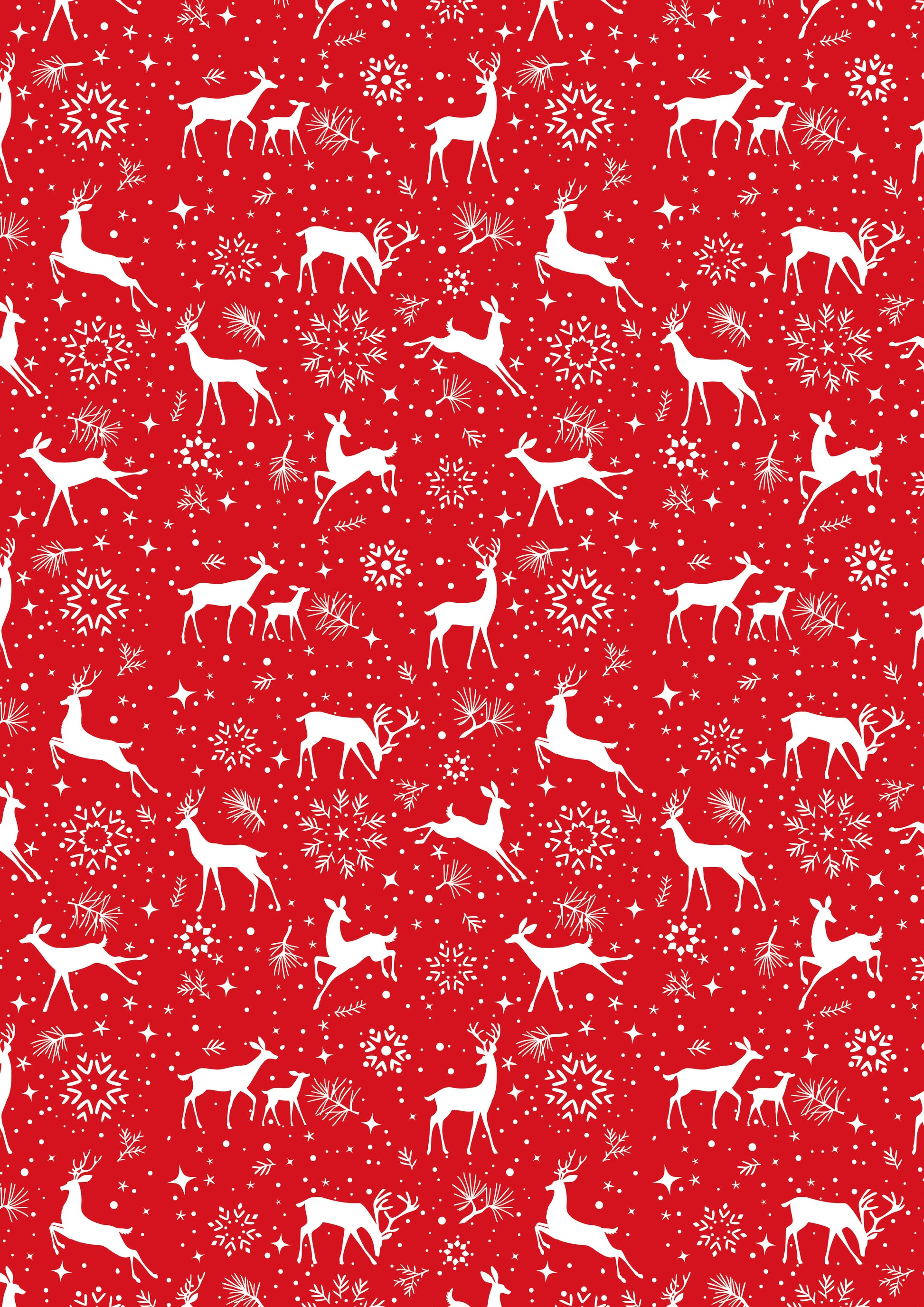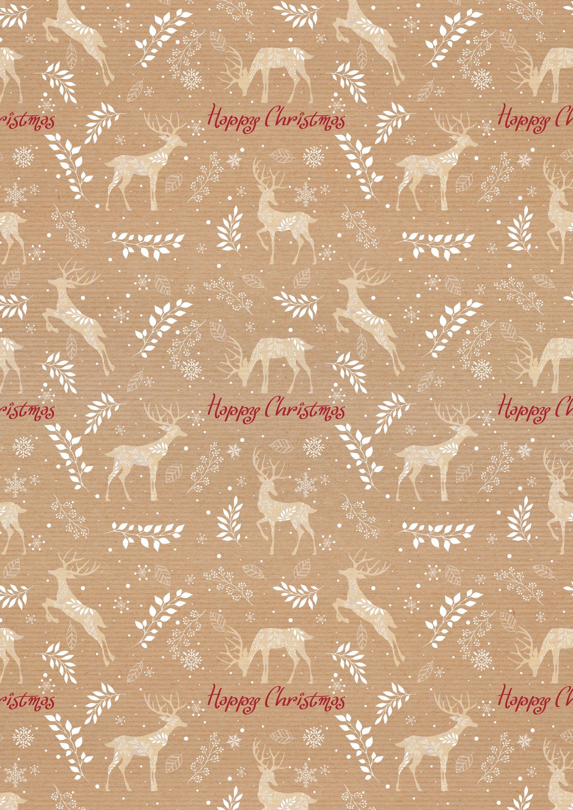 This gift wrap features 2 designs of deer and snowflakes on red paper and brown kraft paper. The red paper design also features small stars, while the brown kraft paper design features leaf shapes and red text that reads 'Happy Christmas'. A matching sticker tags sheet features 4 snowflake designs and 4 deer designs. The pack contains 4 sheets of gift wrap and 8 sticker tags.