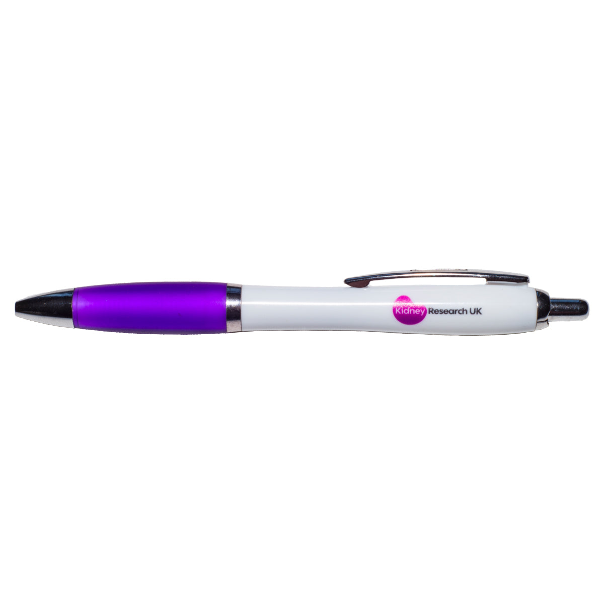 White pen with purple grip. Kidney Research UK logo on front with 'Kidney disease ends here.' on reverse.