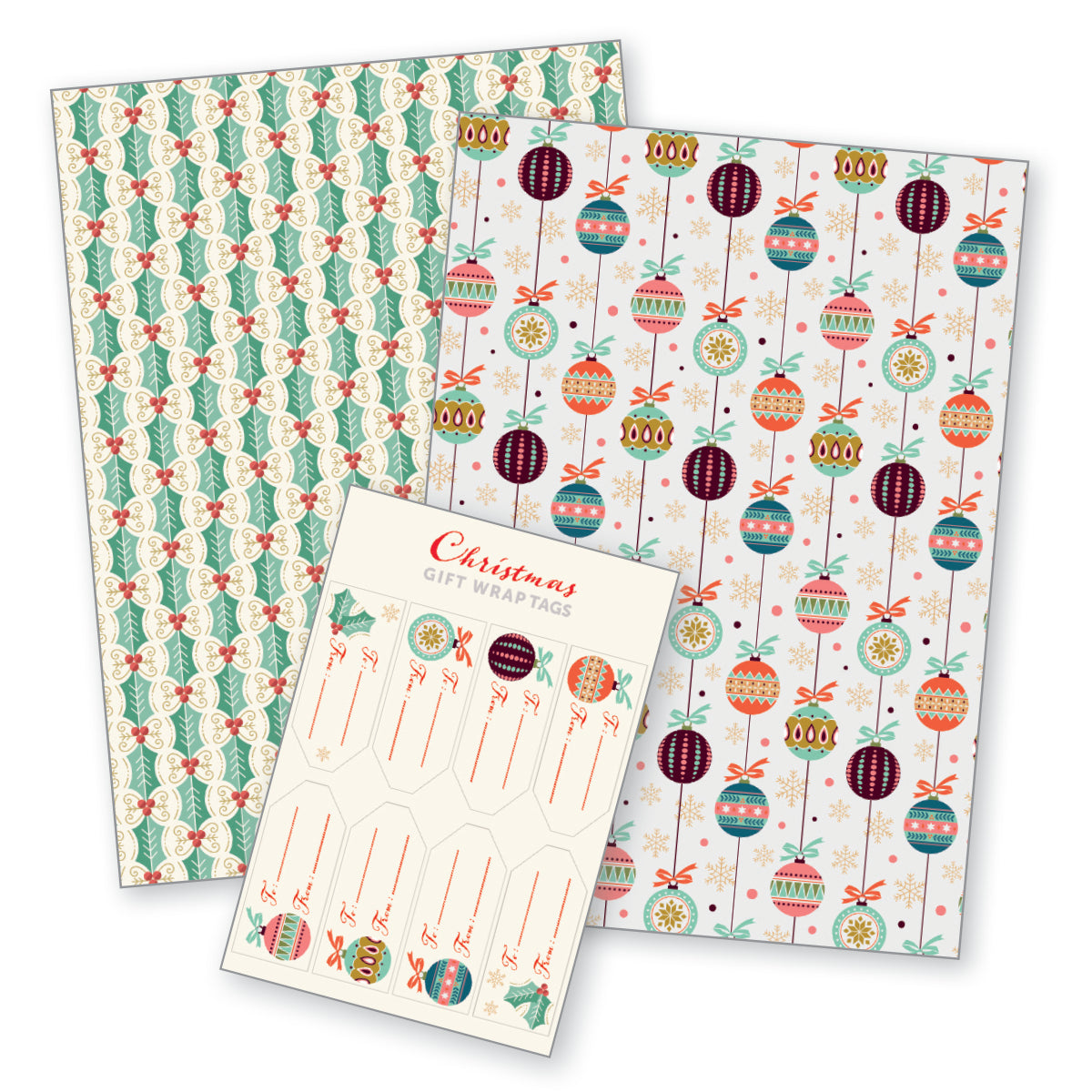 This gift wrap features a 2 designs on light coloured backgrounds, one of colourful Christmas baubles and snowflakes, and one of holly leaves and red berries. A matching sticker tags sheet features 6 different bauble designs and 2 holly leaves and red berries designs. The pack contains 4 sheets of gift wrap and 8 sticker tags.