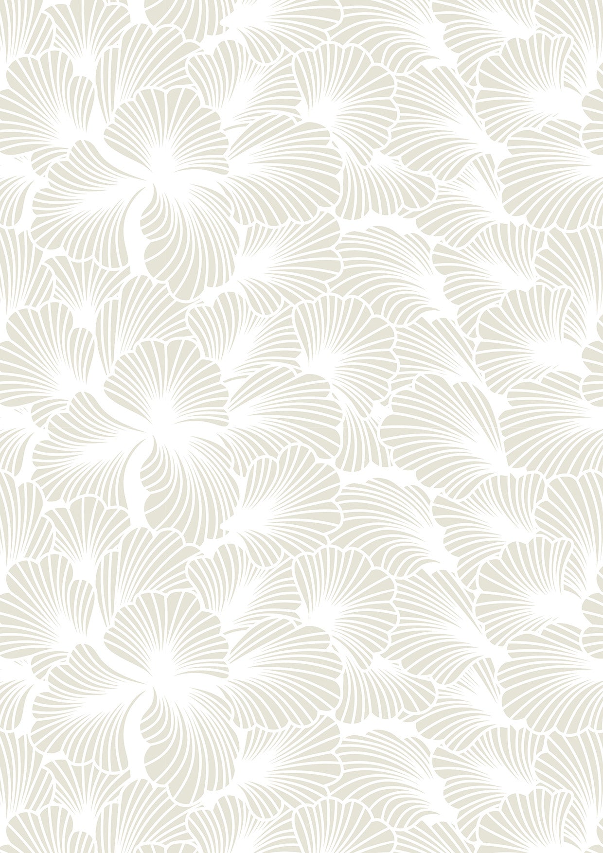 This gift wrap features elegant frilled shapes, like petals or shells, in a soft cream colour on a white background, with matching sticker label sheet. The pack contains 4 sheets of gift wrap and 6 sticker tags.