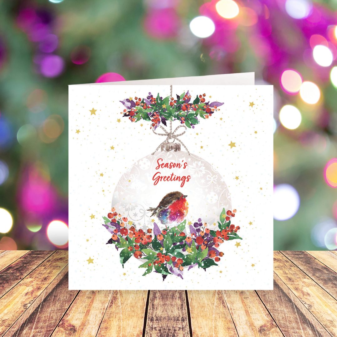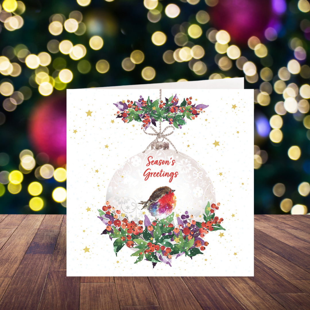 This pack of cards feature a white background with a fluffy robin in a bauble, decorated in red berries and green leaves. "Season's Greetings" is written in red cursive inside the bauble.