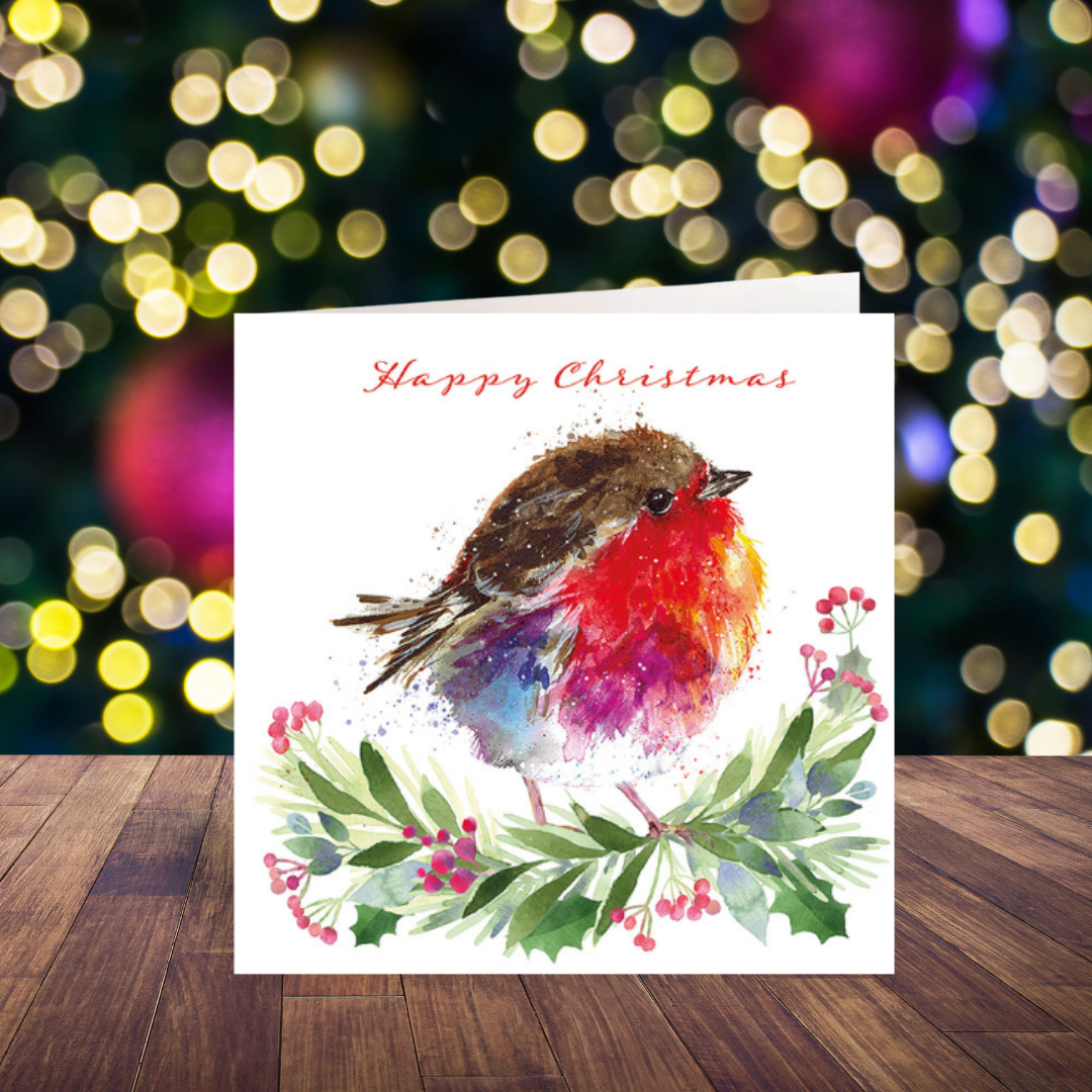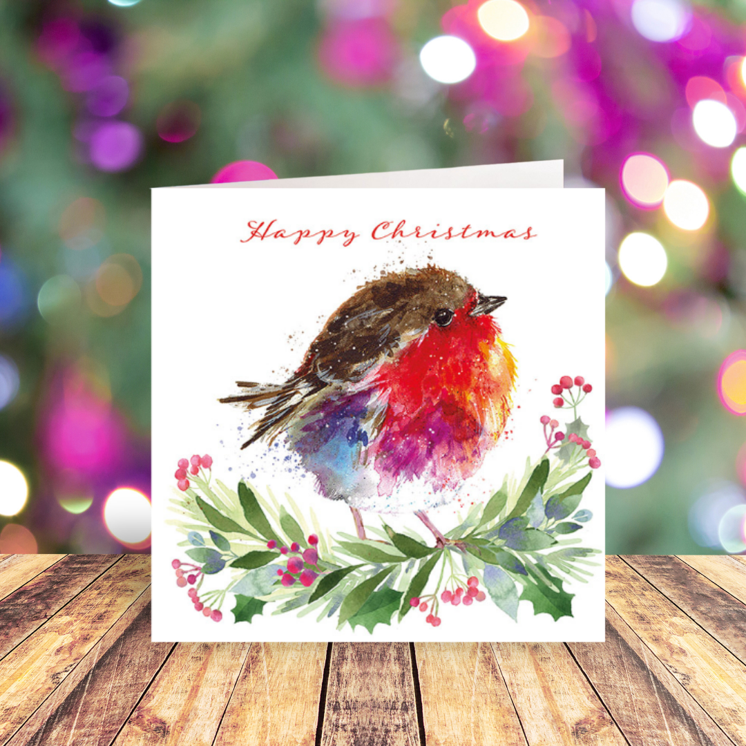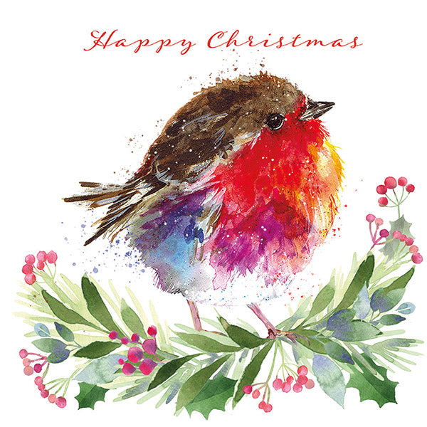 This pack of cards feature a white background with a fluffy watercolour robin standing among green leaves and red berries. "Happy Christmas" is written in red cursive at the top of the design. Inside the card a printed message reads "With Best Wishes for Christmas and the New Year".