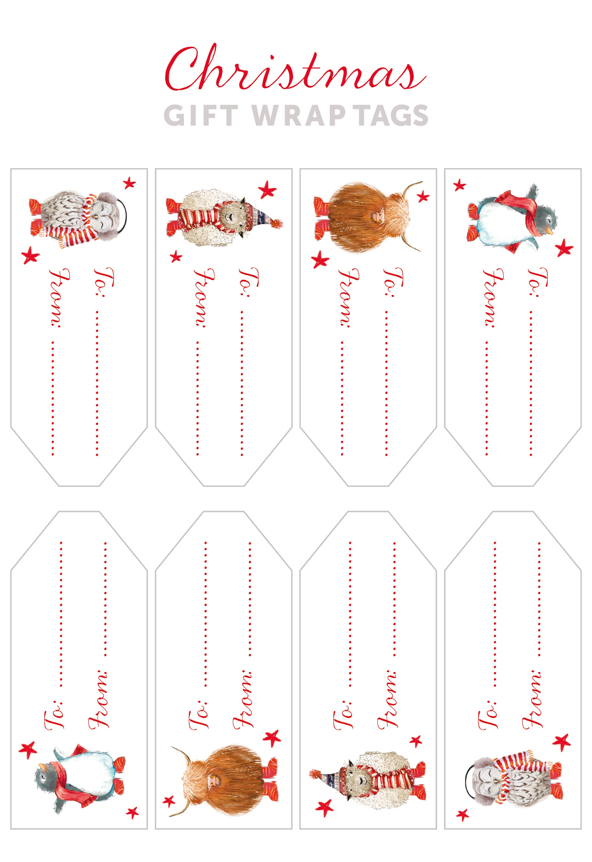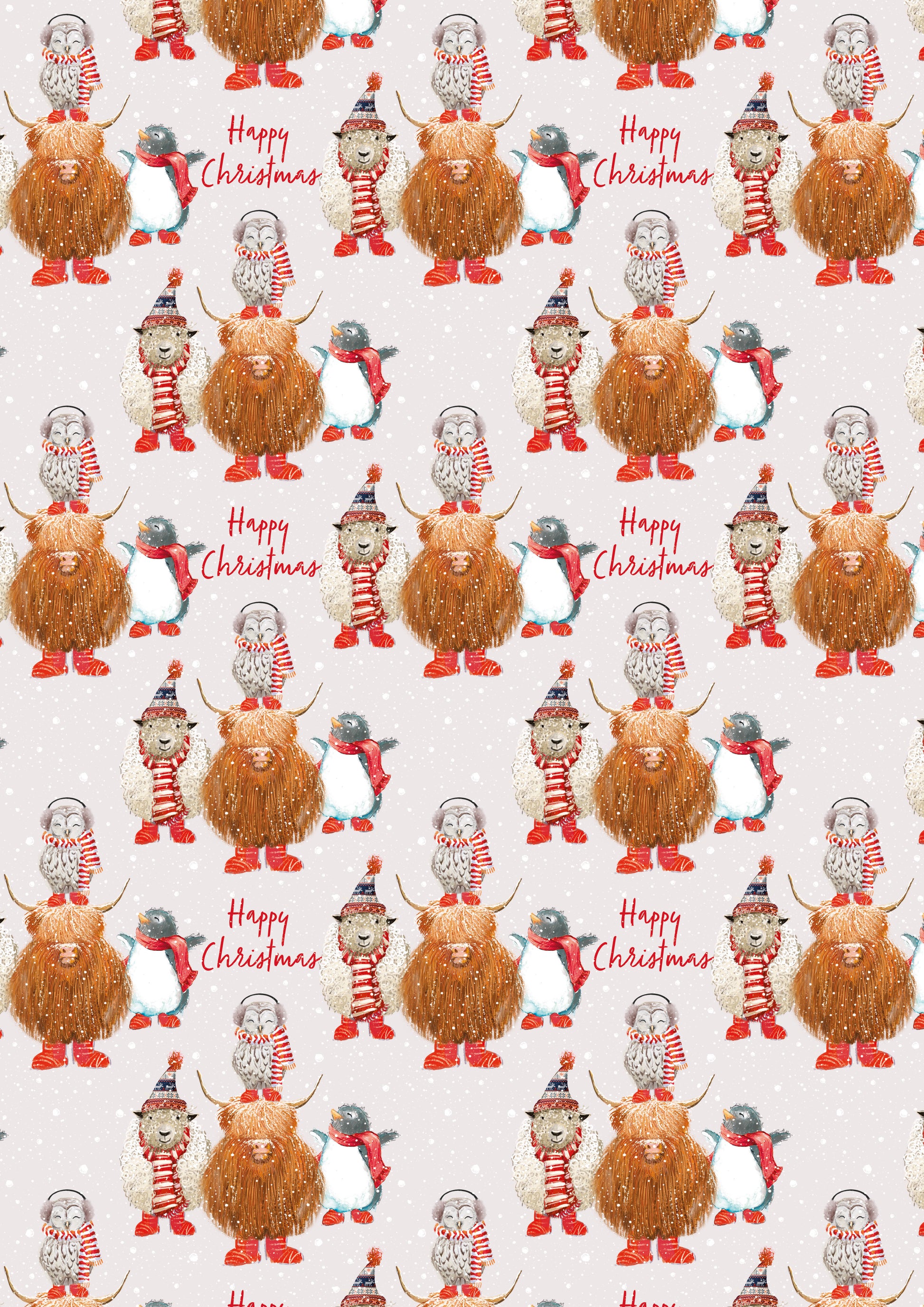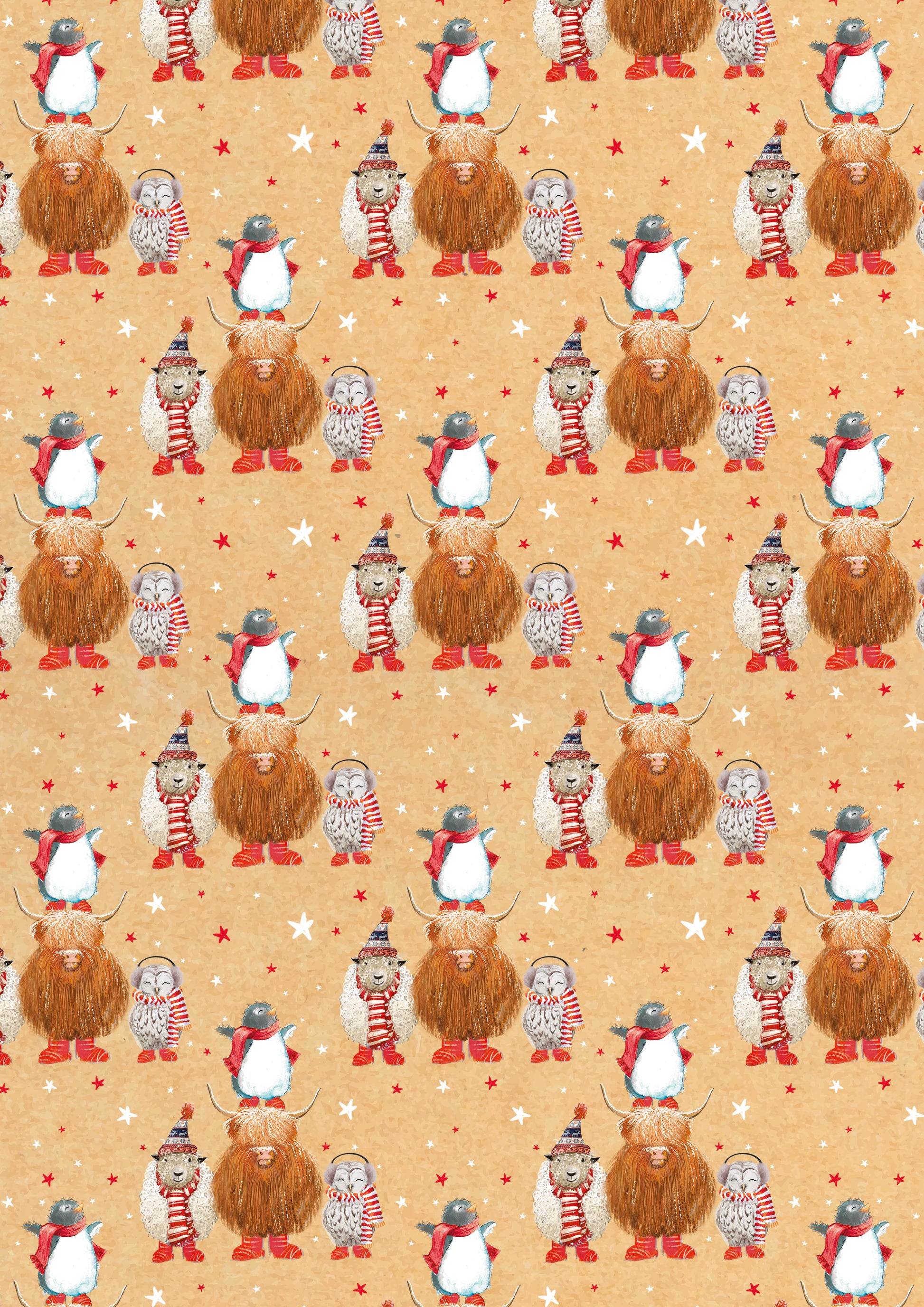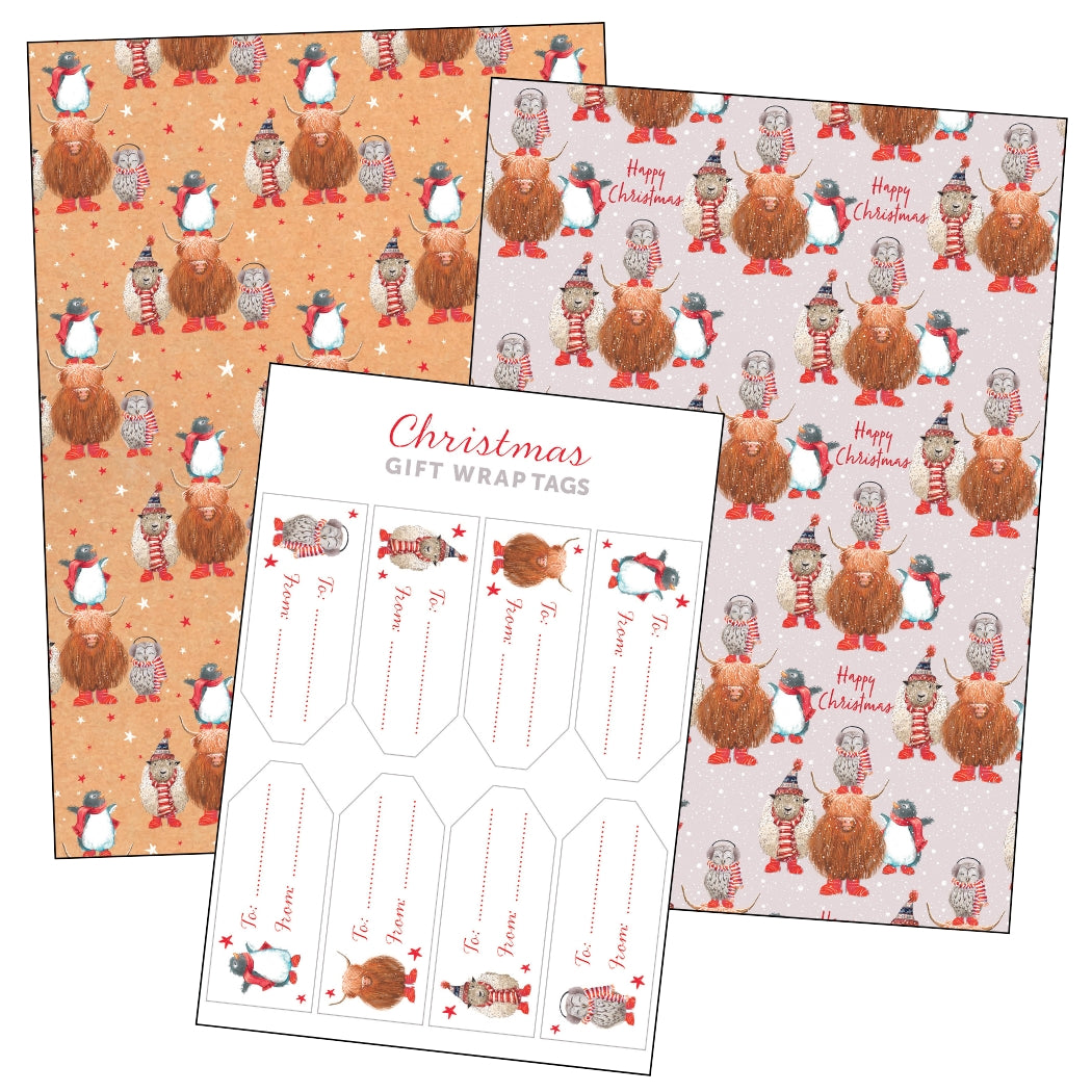 This gift wrap features a repeat design of a sheep, a highland cow, a penguin and an owl wearing knitted hats, scarves, and earmuffs on brown and grey paper backgrounds, with matching sticker tags sheet. The pack contains 4 sheets of gift wrap and 8 sticker tags.