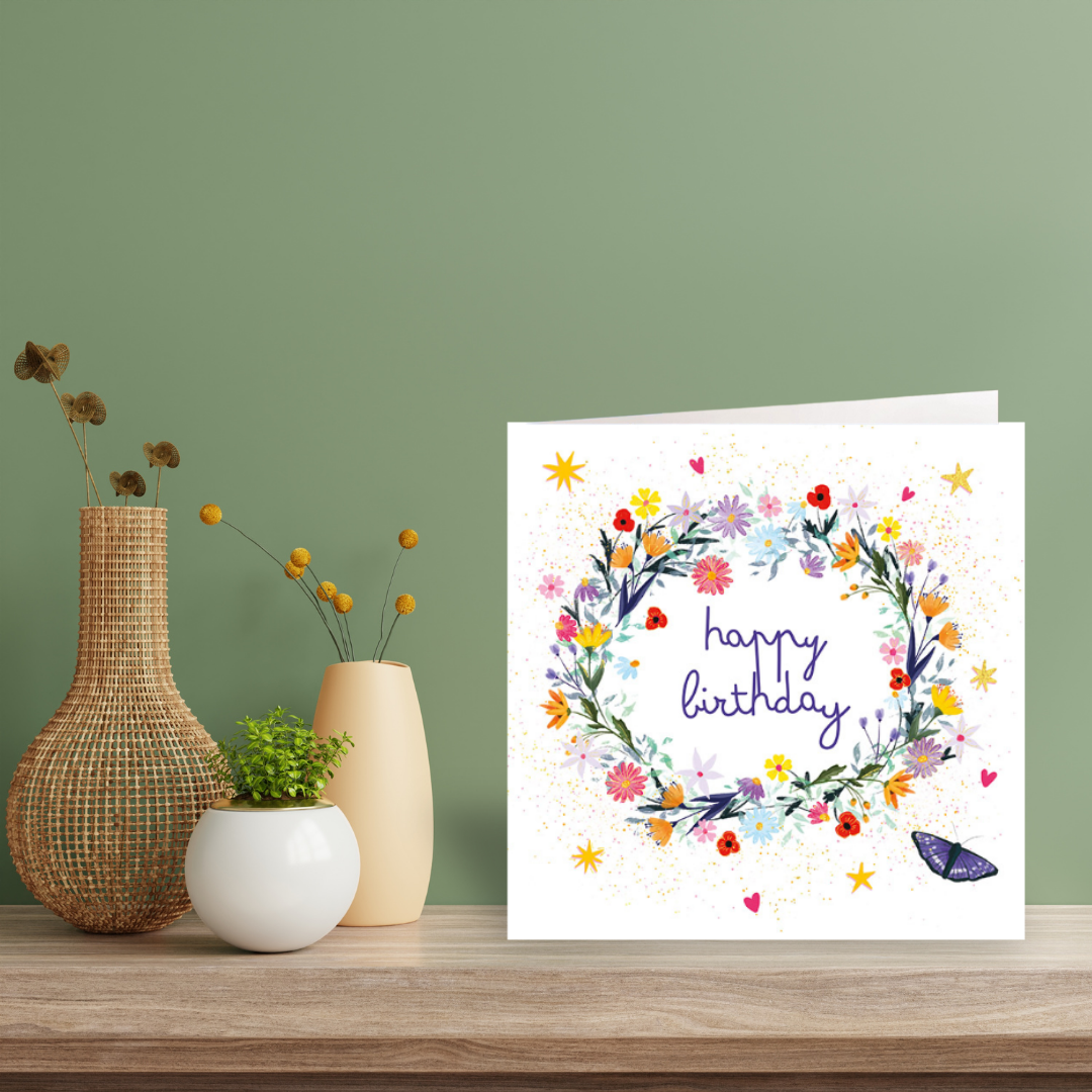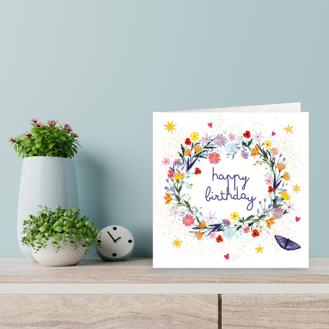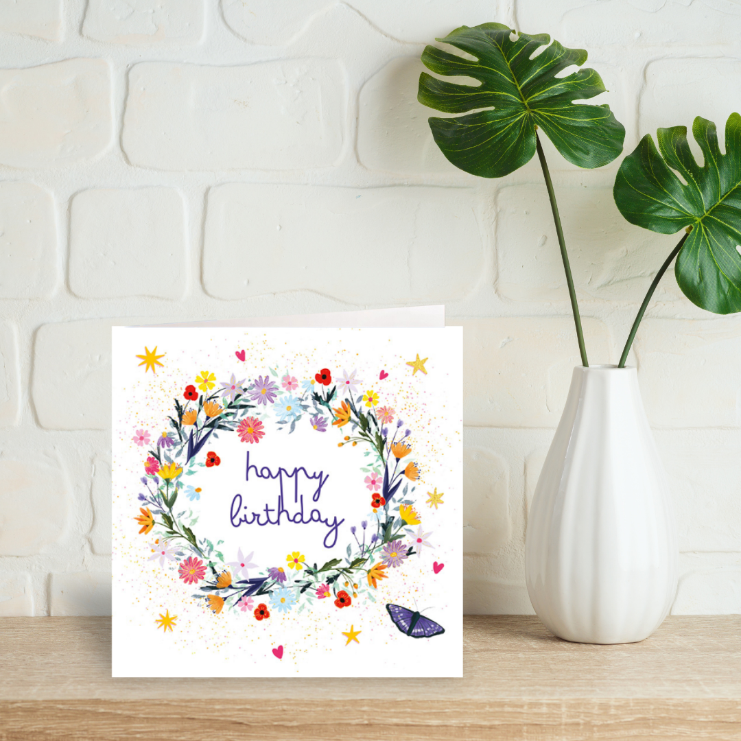 This white card features a colourful floral wreath with hearts and gold foil stars, one blue butterfly, and "happy birthday" written in cursive in the centre.
