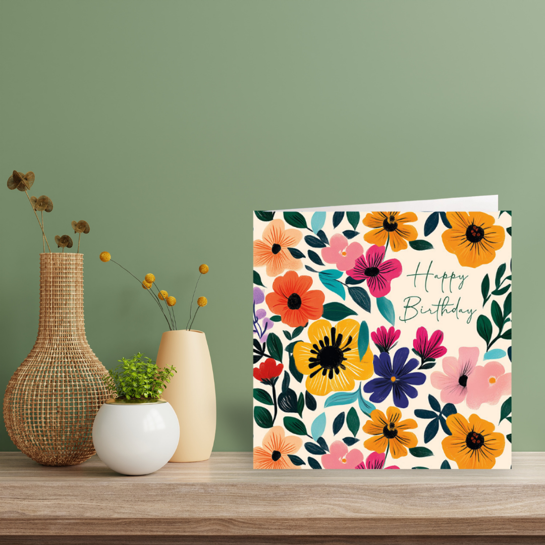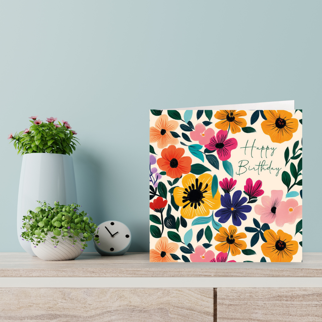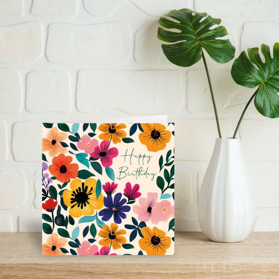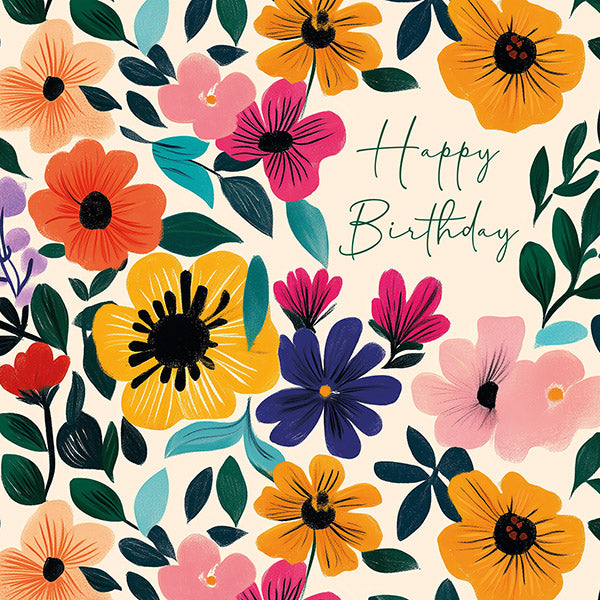 This card features a brightly coloured floral design with "Happy Birthday" written in a cursive font on a light peach background.