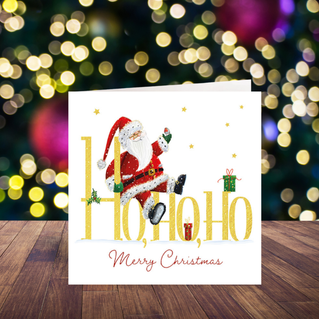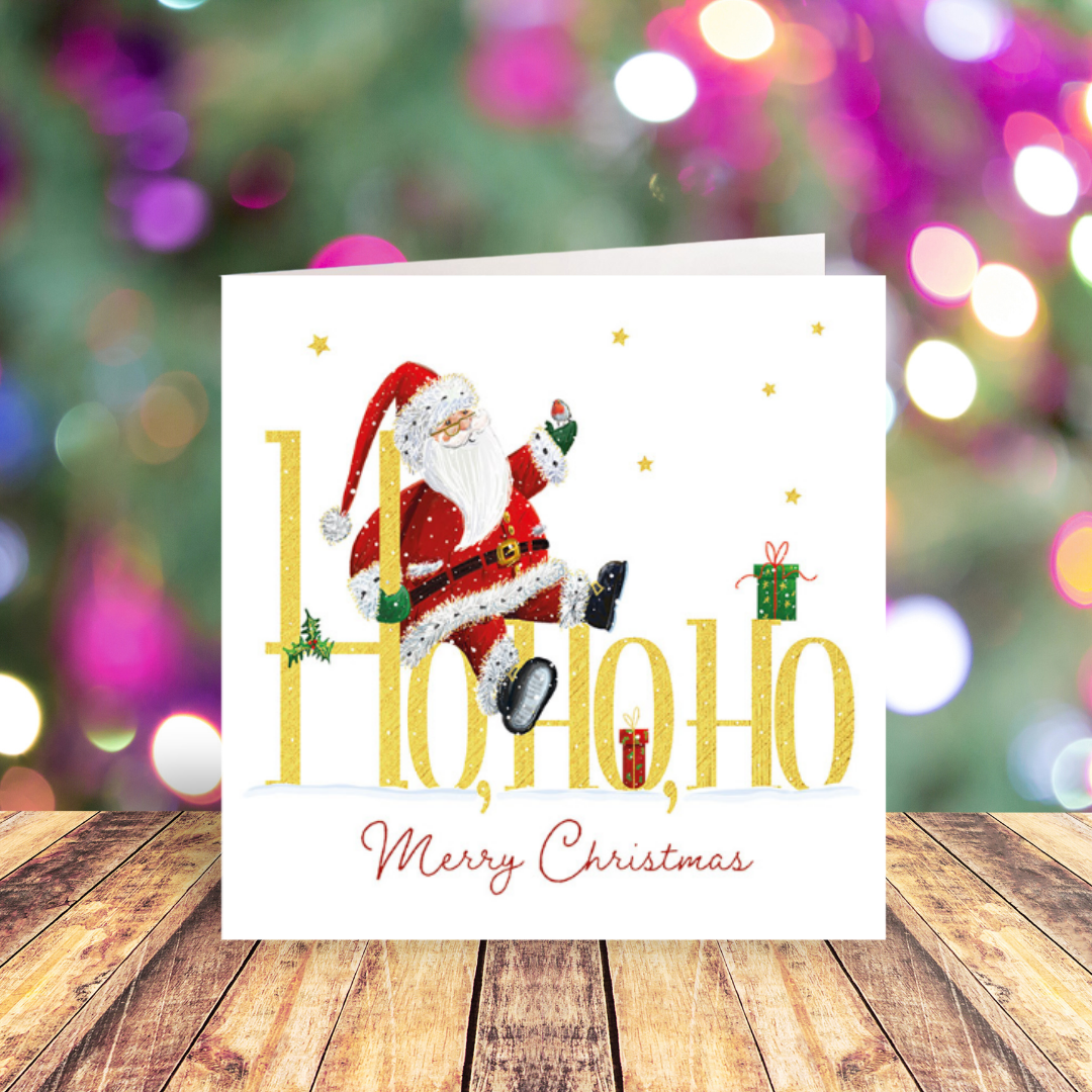 This pack of cards feature a white background with an illustration of Santa sitting on a gold foil "Ho, Ho, Ho", his left hand holding onto the first H as he swings his legs joyfully. A robin is perched on his gloved right hand and gold foil stars are above him. Holly and Christmas presents balance on some of the gold foil letters. Below this, in the bottom centre of the design, "Merry Christmas" is written in red cursive. Inside the card a printed message reads "With Best Wishes for Christmas and the New Year".