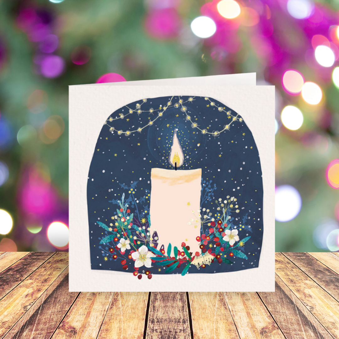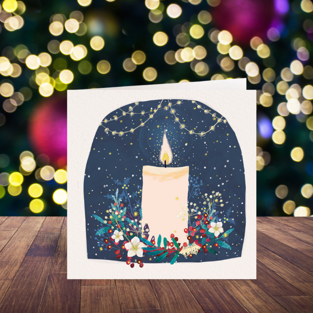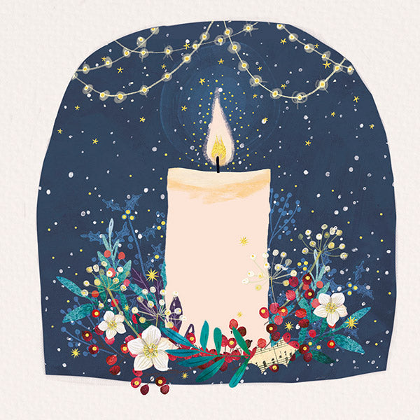 This pack of cards features a lit candle standing amongst flowers, leaves, and red and gold foil berries. The candle is framed by a dark blue arched background with strings of fairy lights hanging across the top of the arch, which is in turn framed by a pale, textured surface to create the sense of an ofrenda or memorial altar. Gold foil details make the fairy lights and candle glow. The message inside these cards reads "Thinking of you".