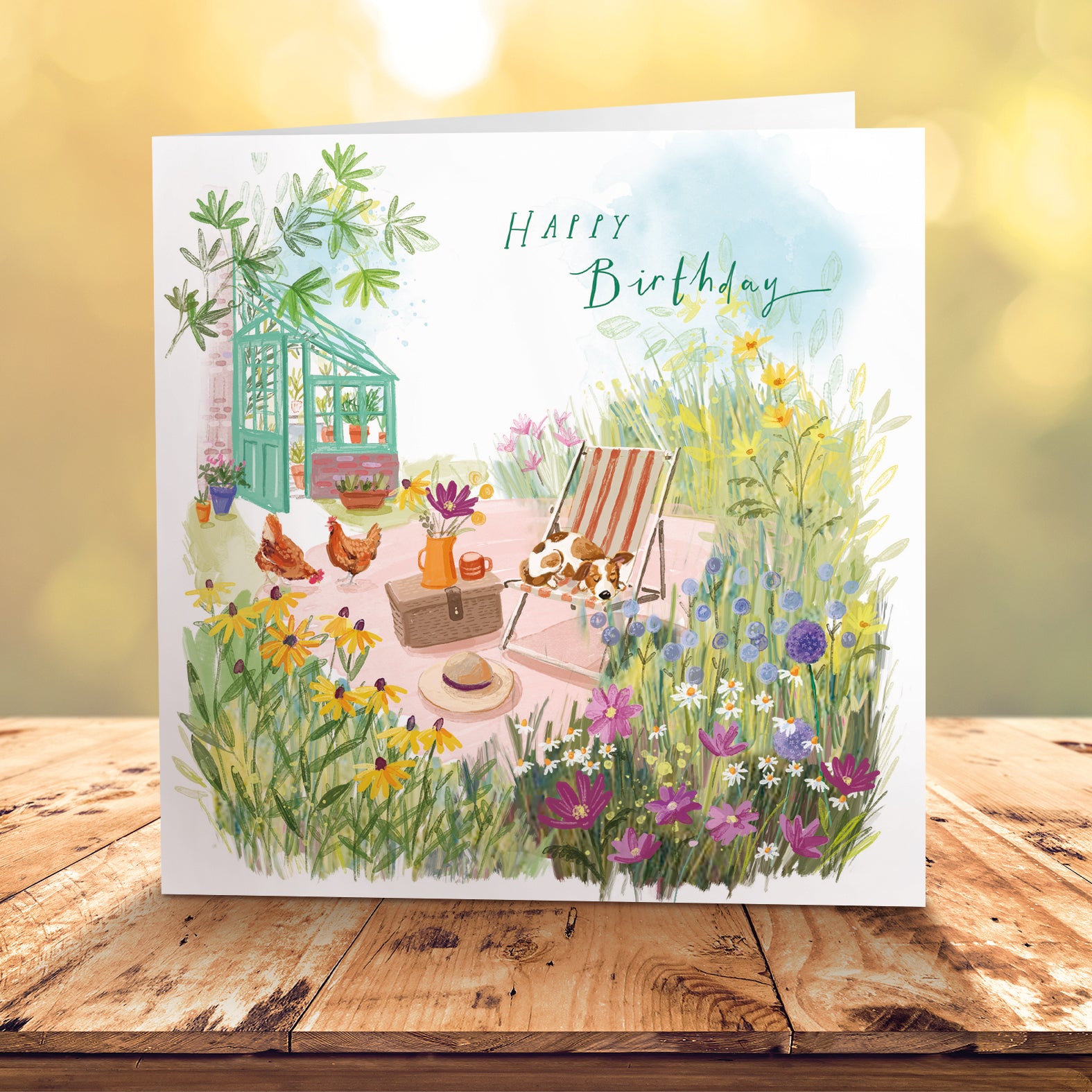This card features a colourful illustrated scene of a garden, filled with flowers, a green house, and chickens. In the centre of the illustration, a dog is curled up on a deck chair beside a picnic basket and a cup of tea, a hat lies on the floor. In the top right of the card are the words "Happy Birthday" in teal green.