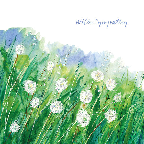 This card features a watercolour design of dandelion seed heads amongst green grasses with silver foil details. "With Sympathy" is written in blue on a white background in the top right.