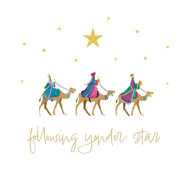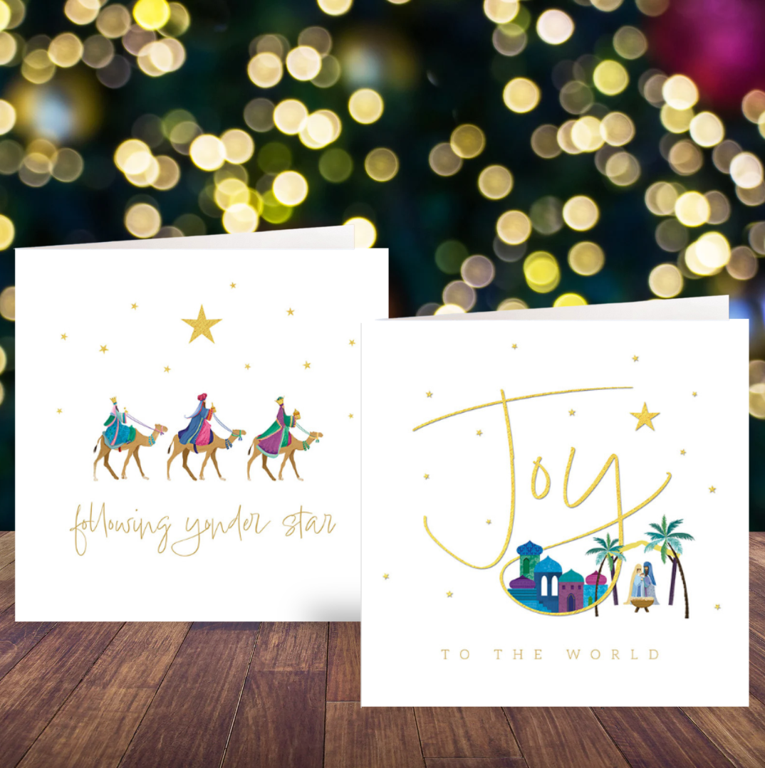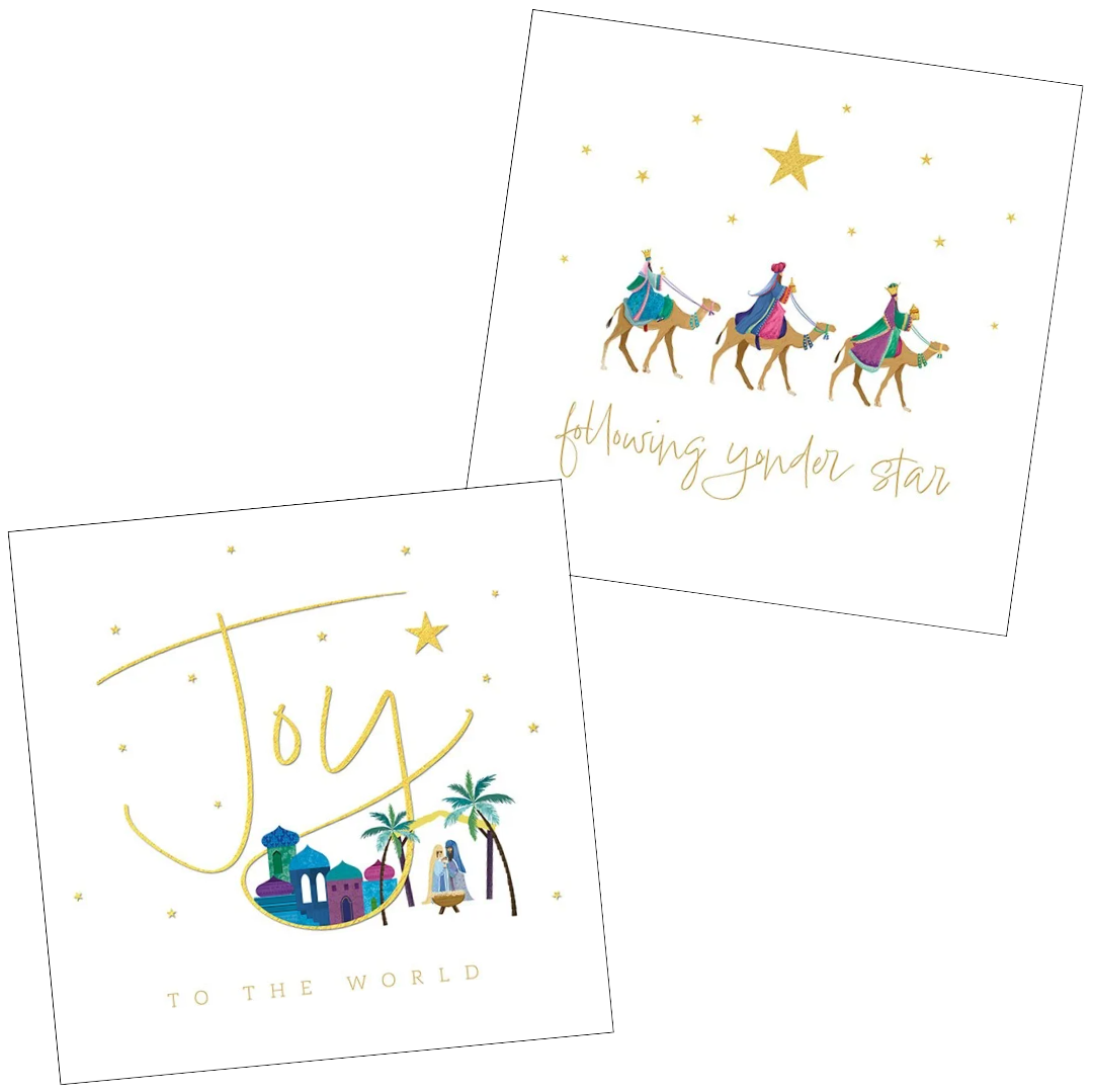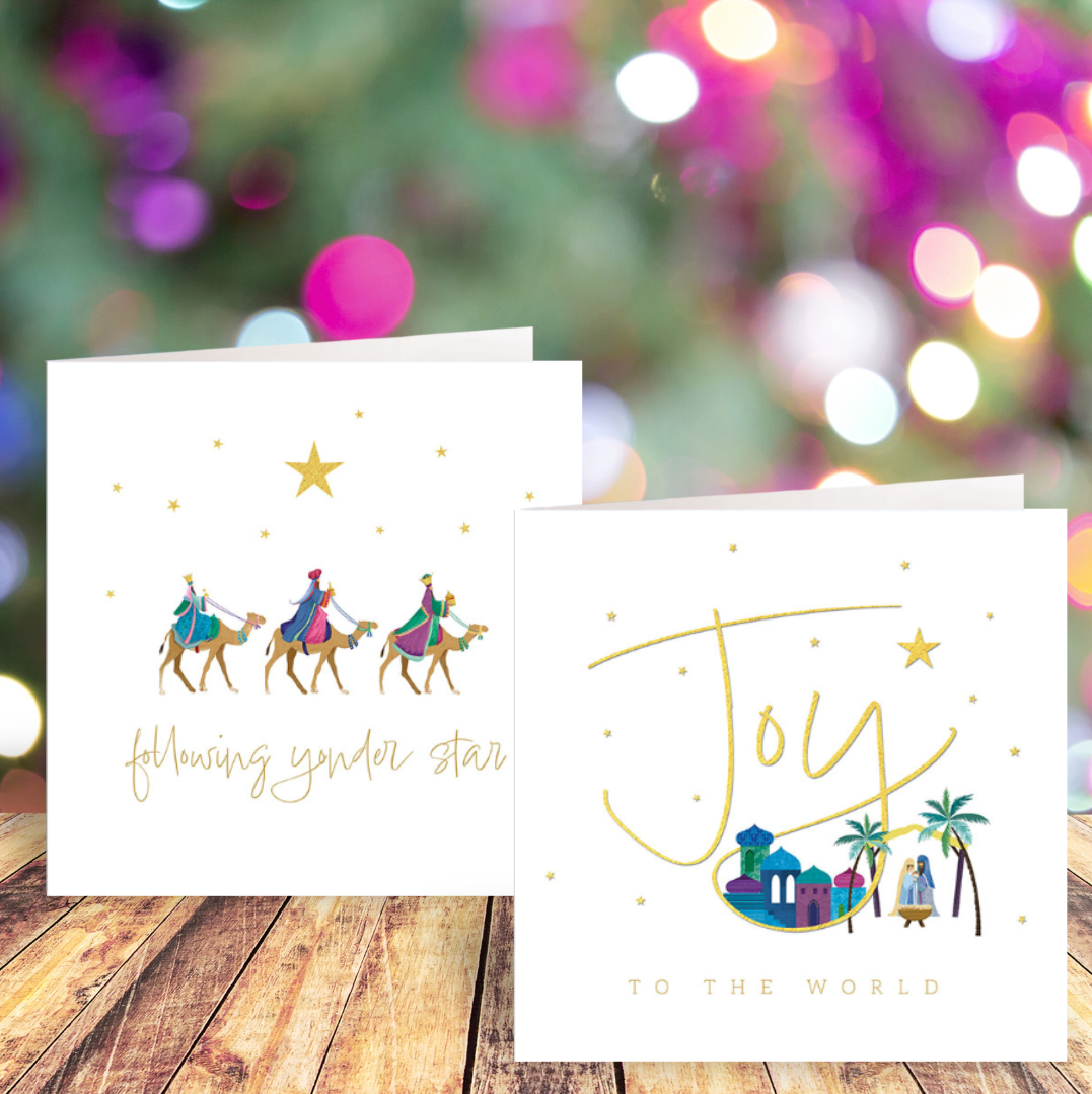 This twin pack of cards includes two religious card designs on white backgrounds. The first design features an illustration of the three wise men in colourful robes, riding camels and carrying gifts. Above the illustration is a large gold foil star and 11 small gold foil stars. Below the illustration, text reads "following yonder star". The second design features large gold foil text that reads "Joy", with an illustrated Bethlehem nestled in the loop of the "y" and a nativity scene. Below this smaller gold foil text reads "to the world", and scattered around the design are a large gold star and 13 small gold stars. Inside both card designs, a printed message reads "With Best Wishes for Christmas and the New Year".