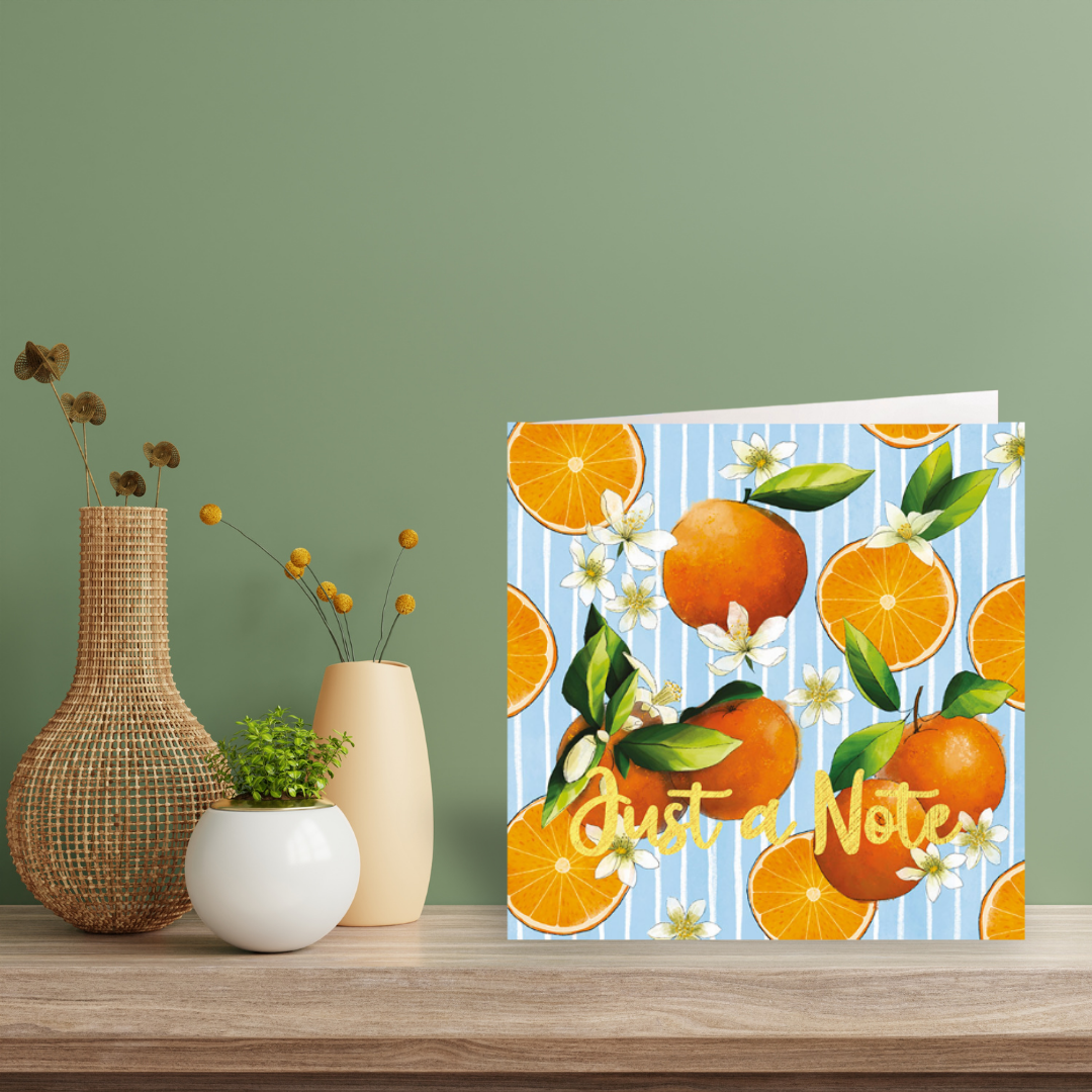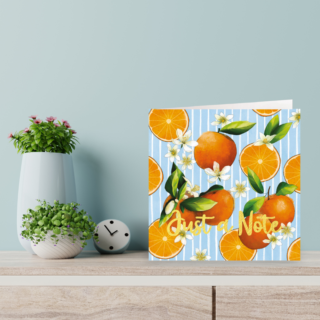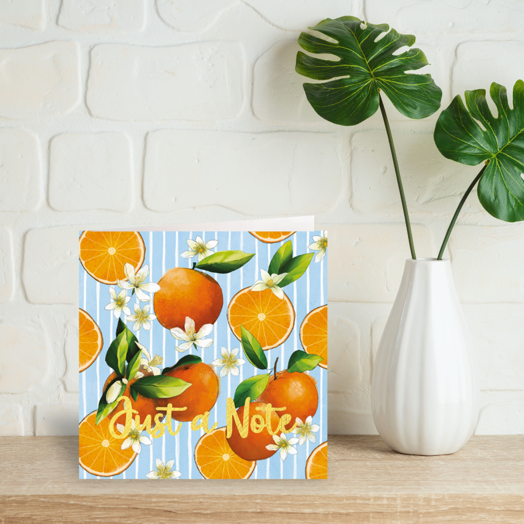 This card features bright summer oranges and blossoms on a blue and white striped background, with "Just a Note" written in gold foil.