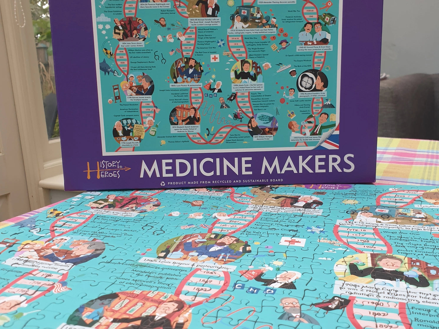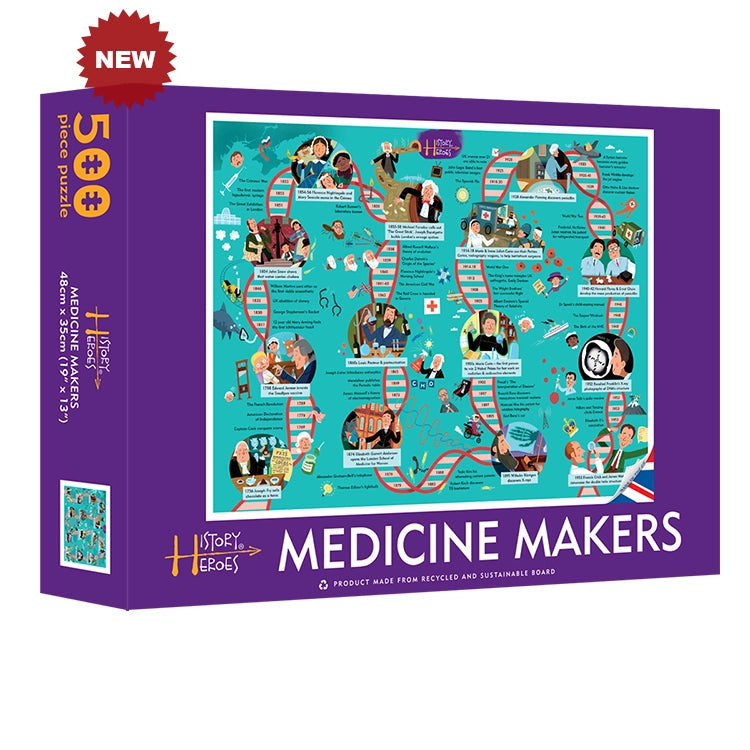 Meet some of the amazing characters and events that have shaped the world of science and medicine in this 500 piece jigsaw. History Heroes Medicine Makers takes you on a journey through 200 years of fast changing medicine and science, from 1756 to 1953. This beautifully illustrated jigsaw features a timeline in the shape of the double-helix, with 14 highlighted History Heroes, who shaped and changed our knowledge of medicine and health together with some of the major global, scientific and technological events that helped shape that journey too.