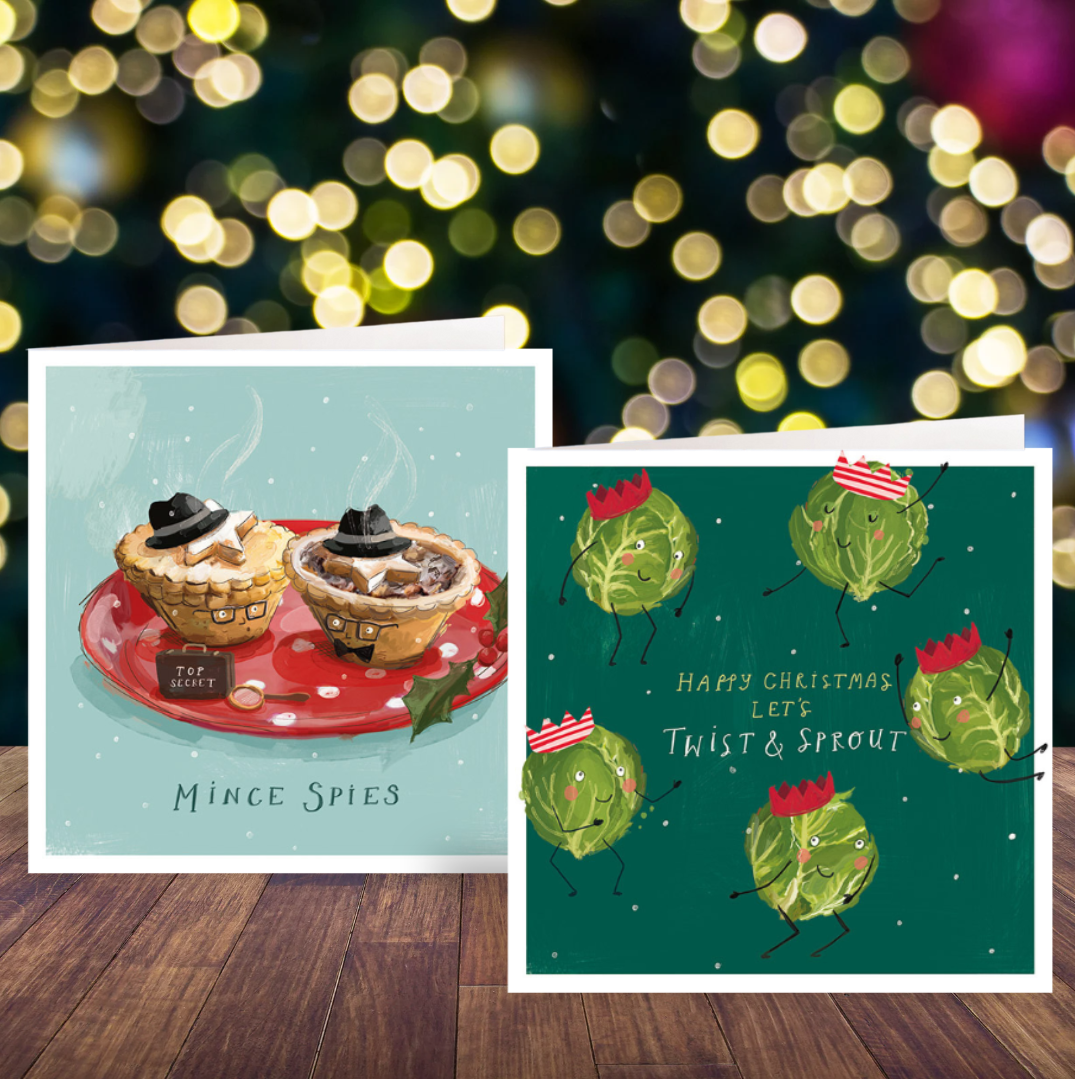 This twin pack of cards includes two card designs. The first design features an illustration of a red plate with two mince pies with faces, both wearing glasses and hats, with one also wearing a bow tie. The background is light blue with white dots and a white border around the edge, and text below the illustration reads "Mince Spies". The second design features five illustrated brussel sprouts with rosy cheeked smiling faces, dancing arms and legs, and wearing red Christmas cracker crowns. The background is dark green with white dots and a white border around the edge, and text in the centre of the design reads "Happy Christmas let's twist & sprout". Inside both card designs, a printed message reads "With Best Wishes for Christmas and the New Year".
