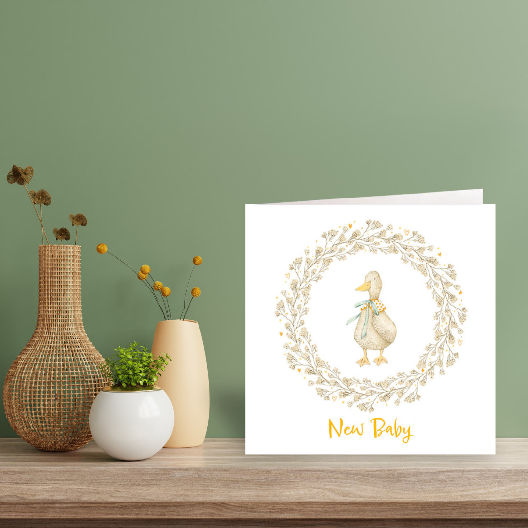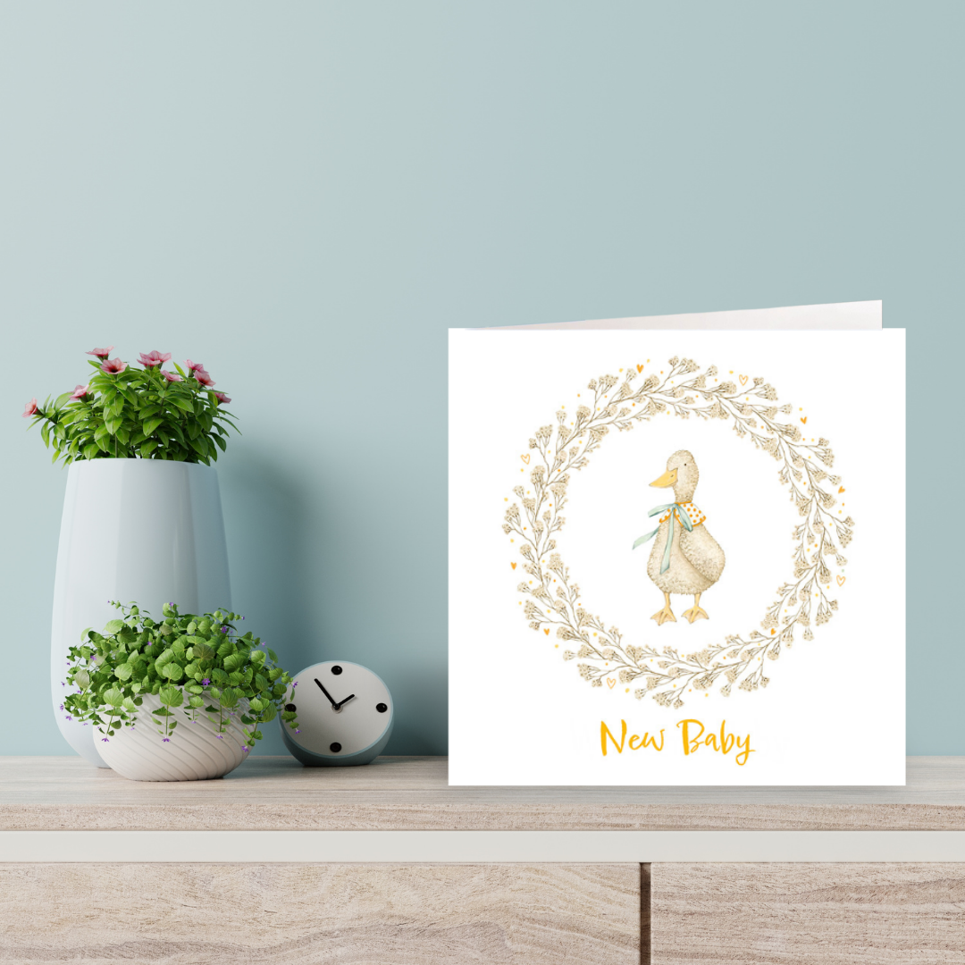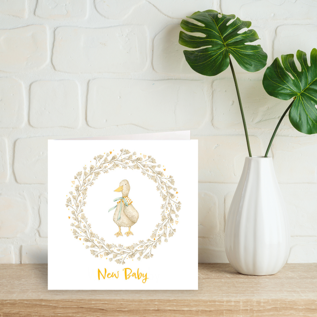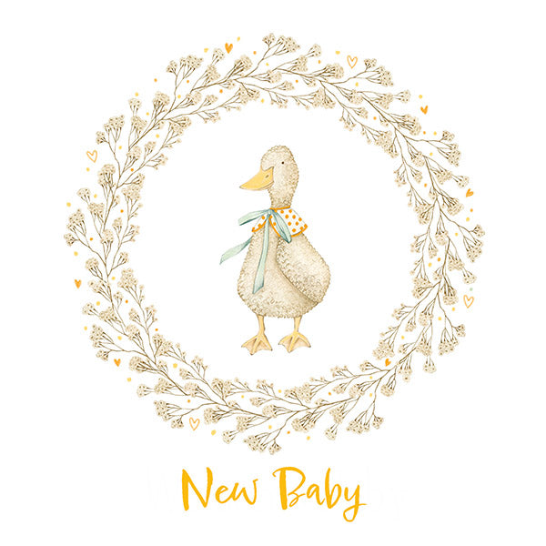 This card features a circle of baby's breath flowers surround a duck wearing a yellow collar with a light blue ribbon, with "New Baby" written in yellow cursive at the bottom of the design. The design pairs well with our Elegant Frills gift wrap.