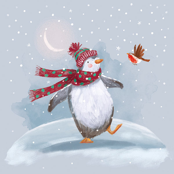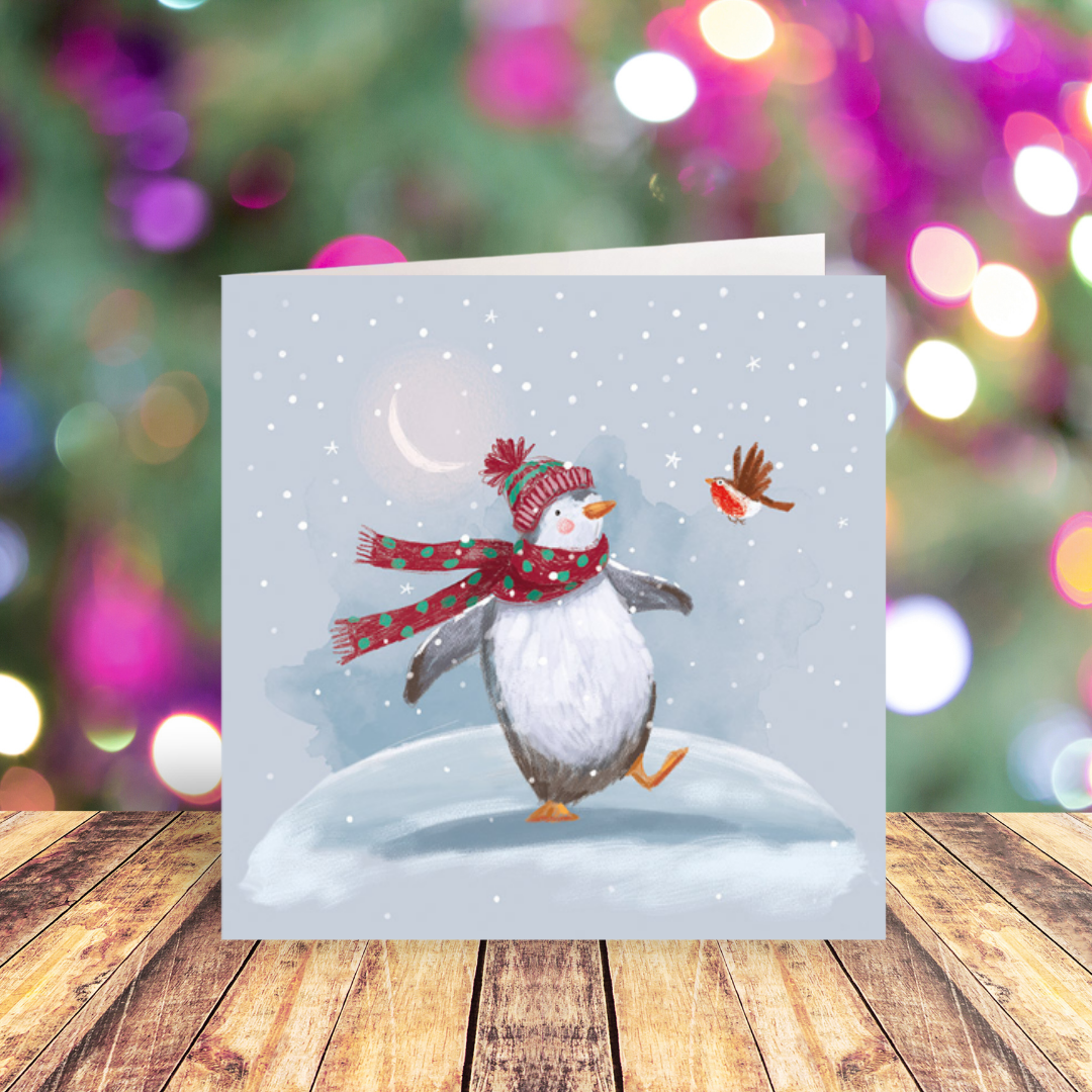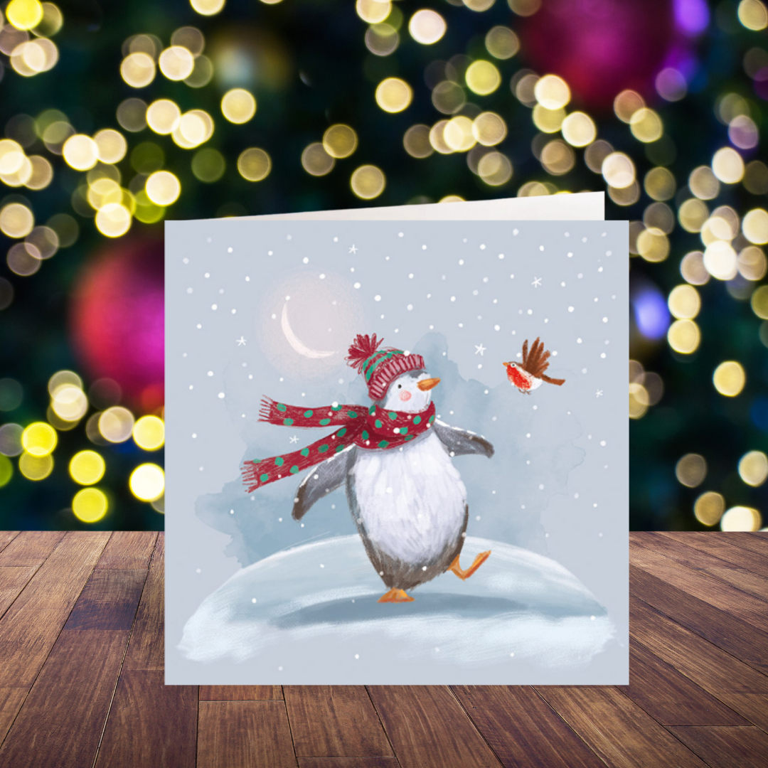 This pack of cards features a penguin wearing a red scarf with green dots and a striped red and green bobble hat. The penguin looks at a robin flying beside it, as snow falls around them and a thin slither of moon shines above them. Inside the card a printed message reads "With Best Wishes for Christmas and the New Year".