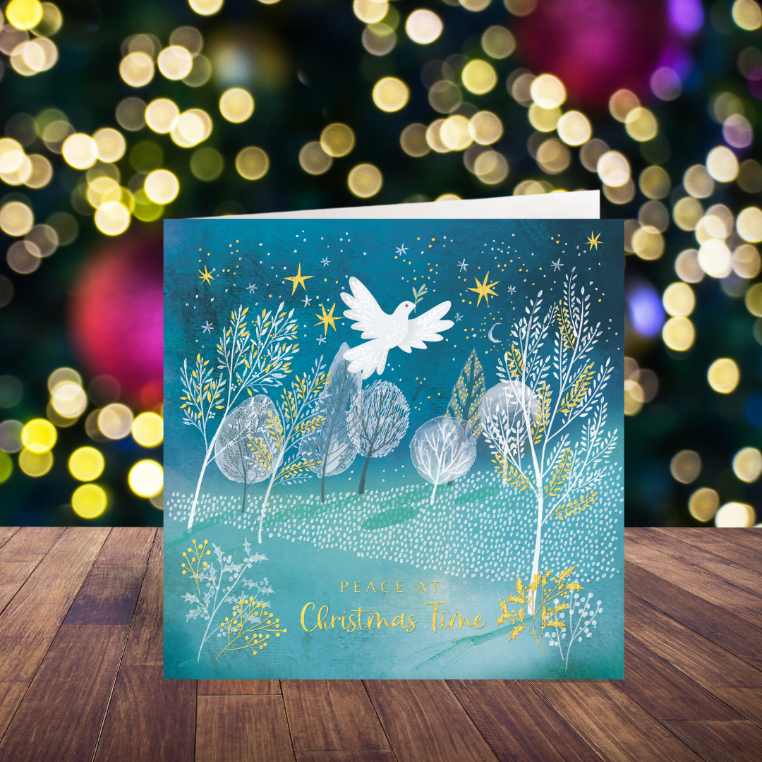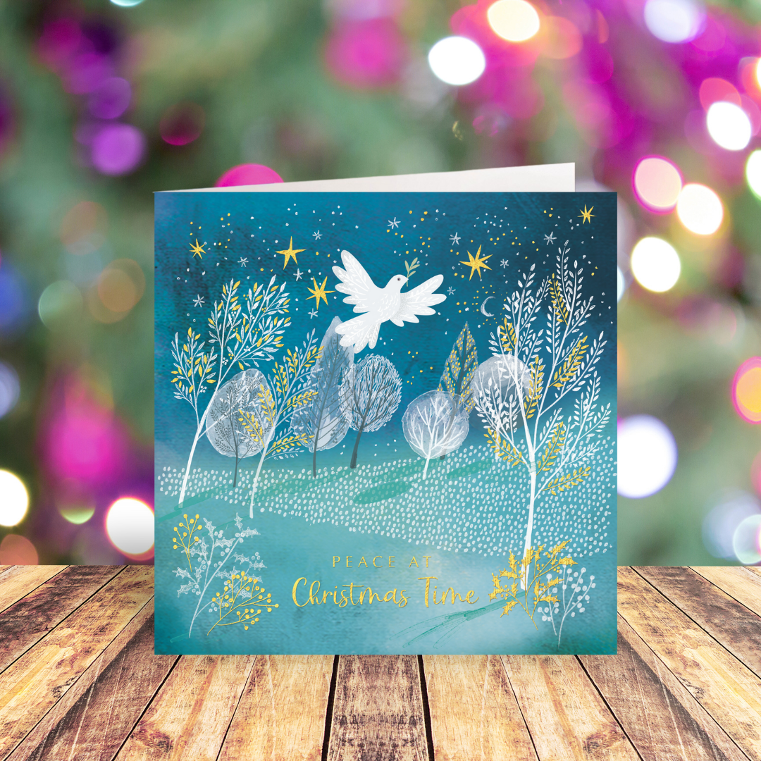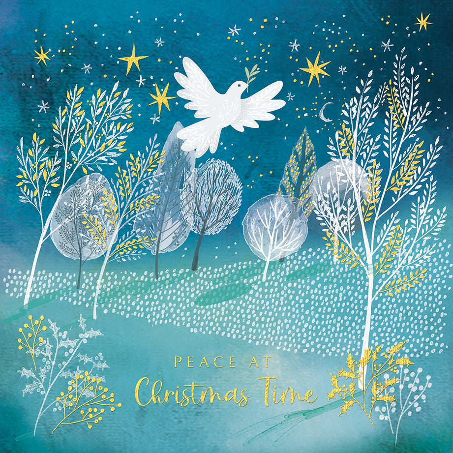 This pack of cards features a beautiful design of a white dove holding an olive as it flies through the night sky. White and gold foil stars and trees create a delicate landscape on a background of blues and greens, while white and gold foil sprigs of holly and branches of berries frame the gold foil "Peace at Christmas Time" at the bottom of the design.