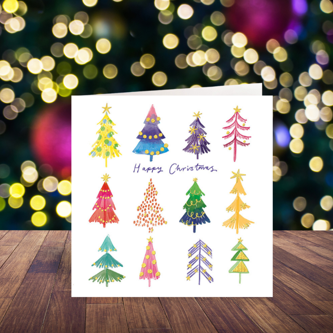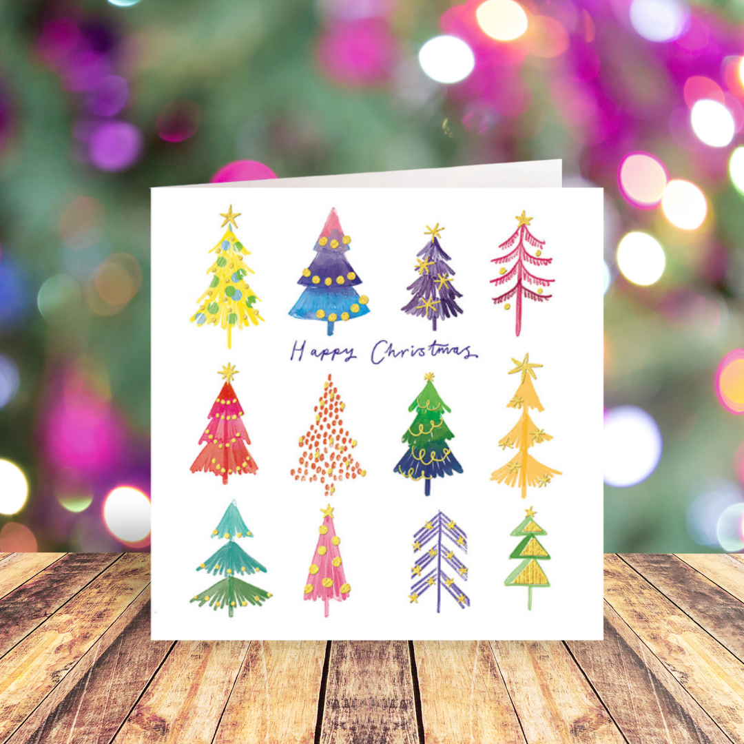 This pack of cards features 12 illustrated Christmas trees, drawn in all different shapes, colours, patterns and styles, some with felt-tip pen effects and others with watercolour effects. Gold foil embellishments create sparkly Christmas tree decorations. The trees are arranged in 3 rows of 4 trees, with "Happy Christmas" written in a deep blue cursive font between the top and middle row of trees. Inside the card a printed message reads "With Best Wishes for Christmas and the New Year".