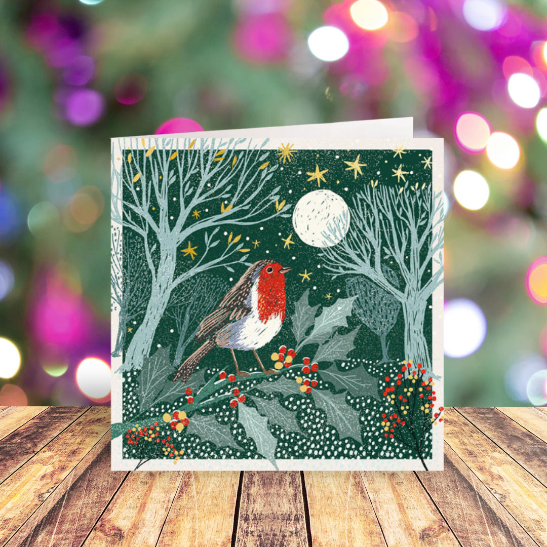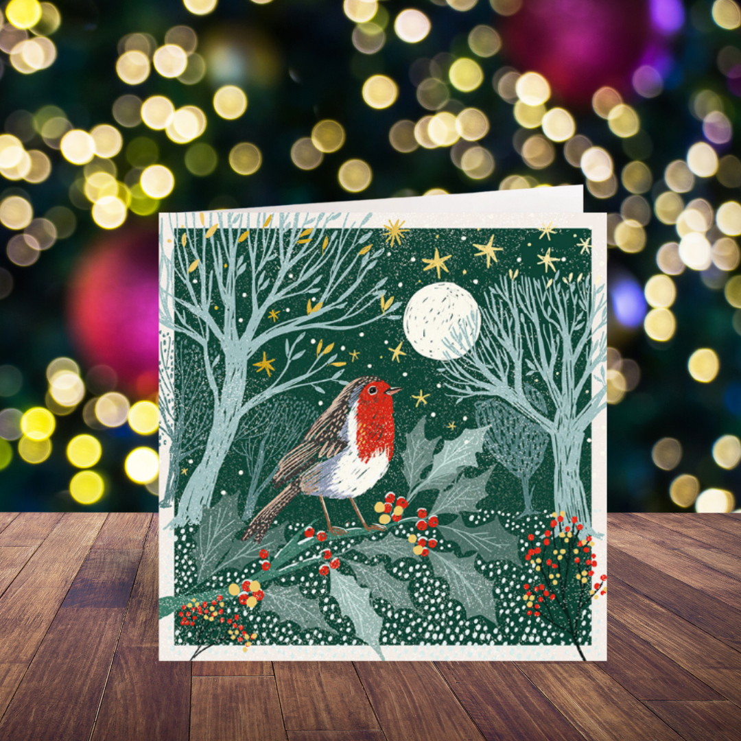 This pack of cards feature a beautiful lino cut design of a robin perched on a holly branch, surrounded by trees, with the moon above. Gold foil details pick out some of the red berries and leaves on the trees, and gold foil stars filled the sky. The background is dark green, with light border around the edge. Inside the card a printed message reads "With Best Wishes for Christmas and the New Year".