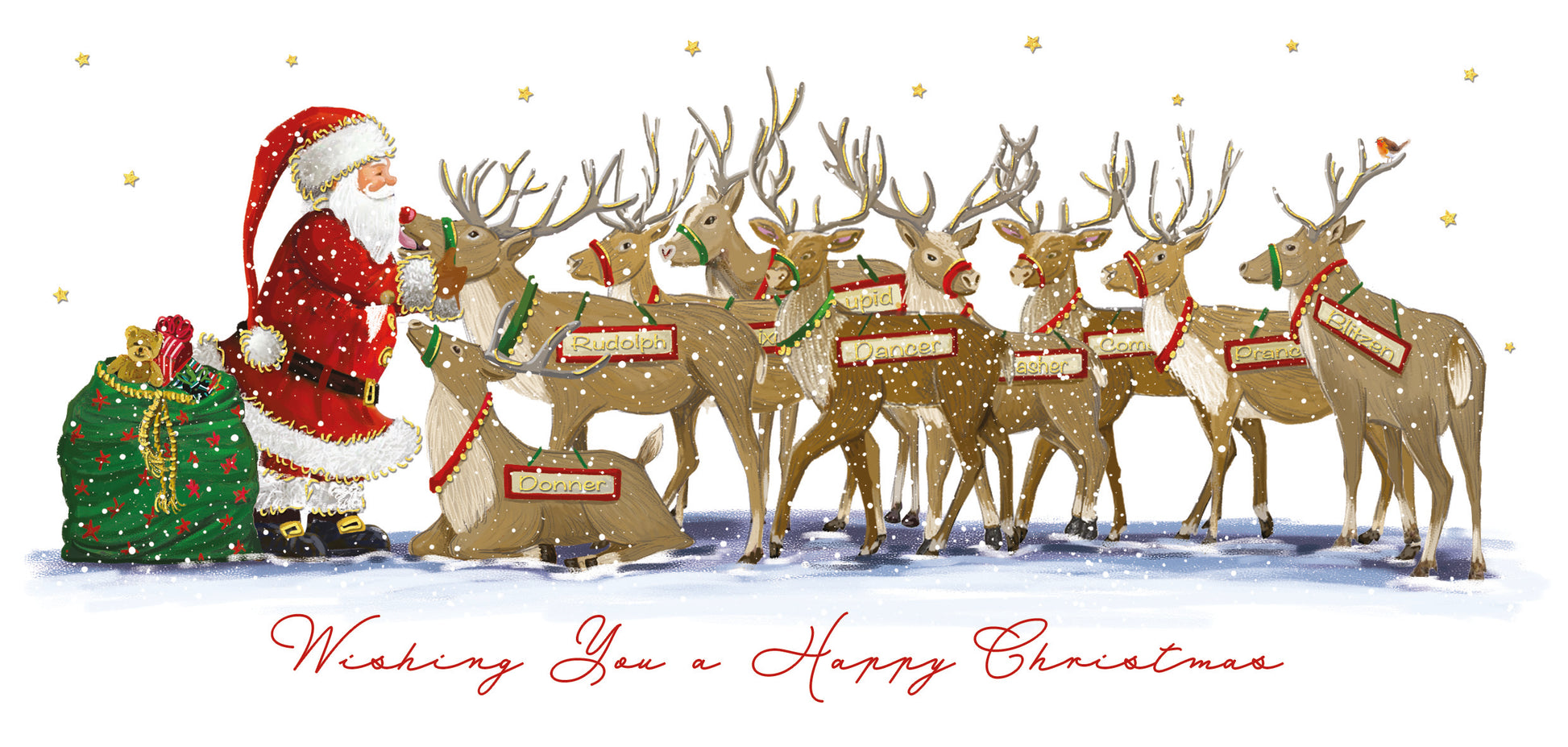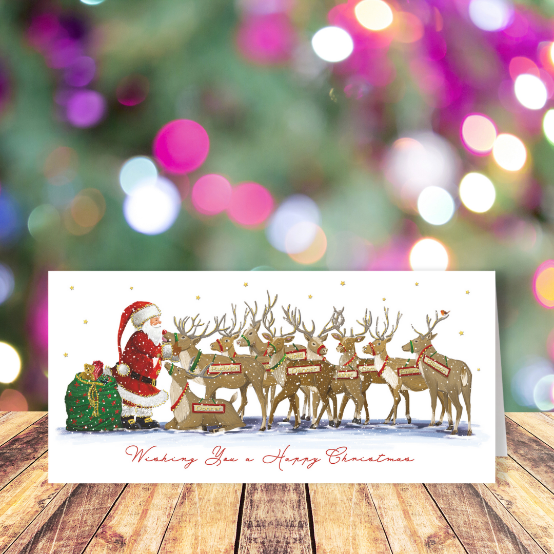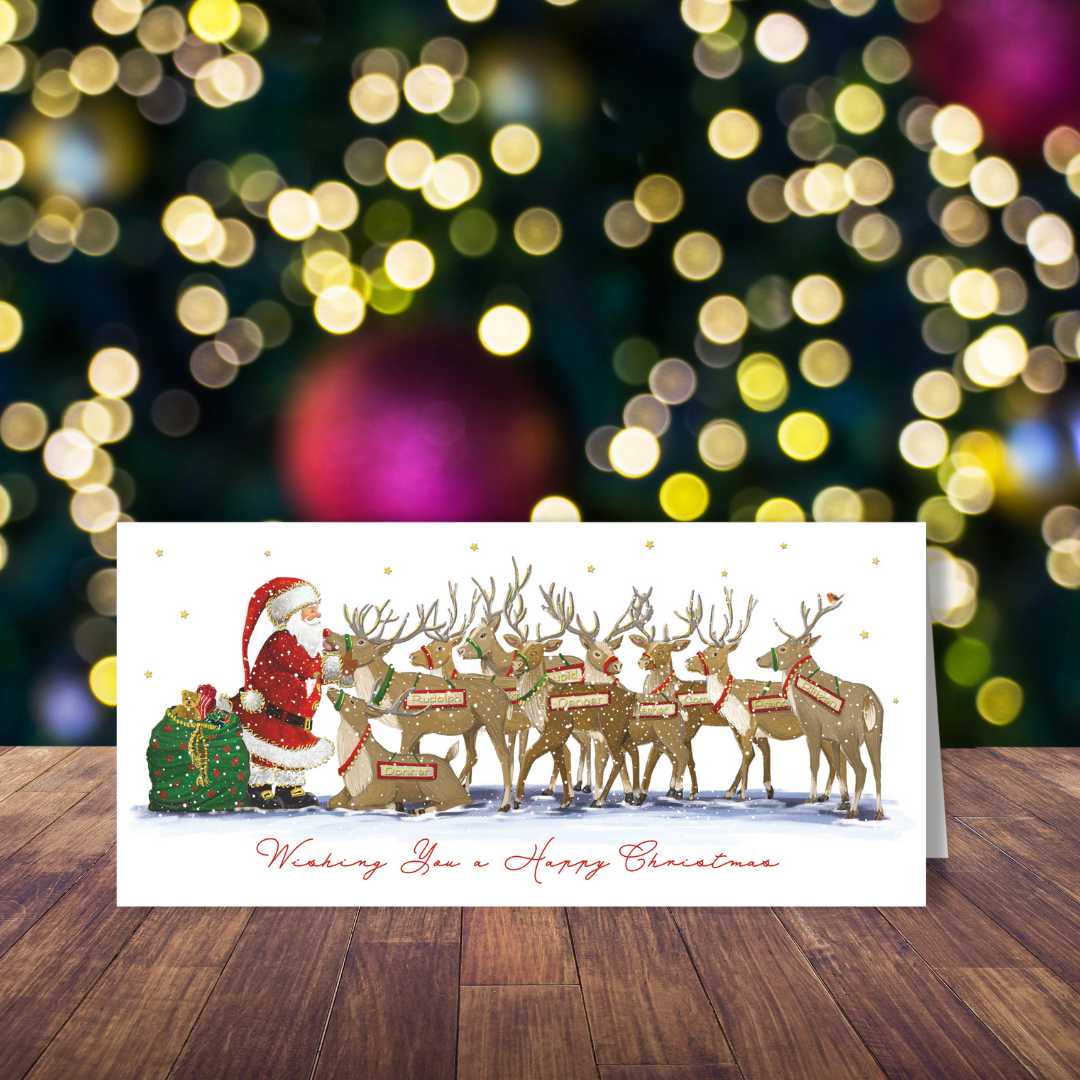 A beautiful way to gift money or vouchers. This money wallet features Santa with a green sack full of presents and nine reindeer. "Wishing You a Happy Christmas" is written in red cursive at the bottom of the design