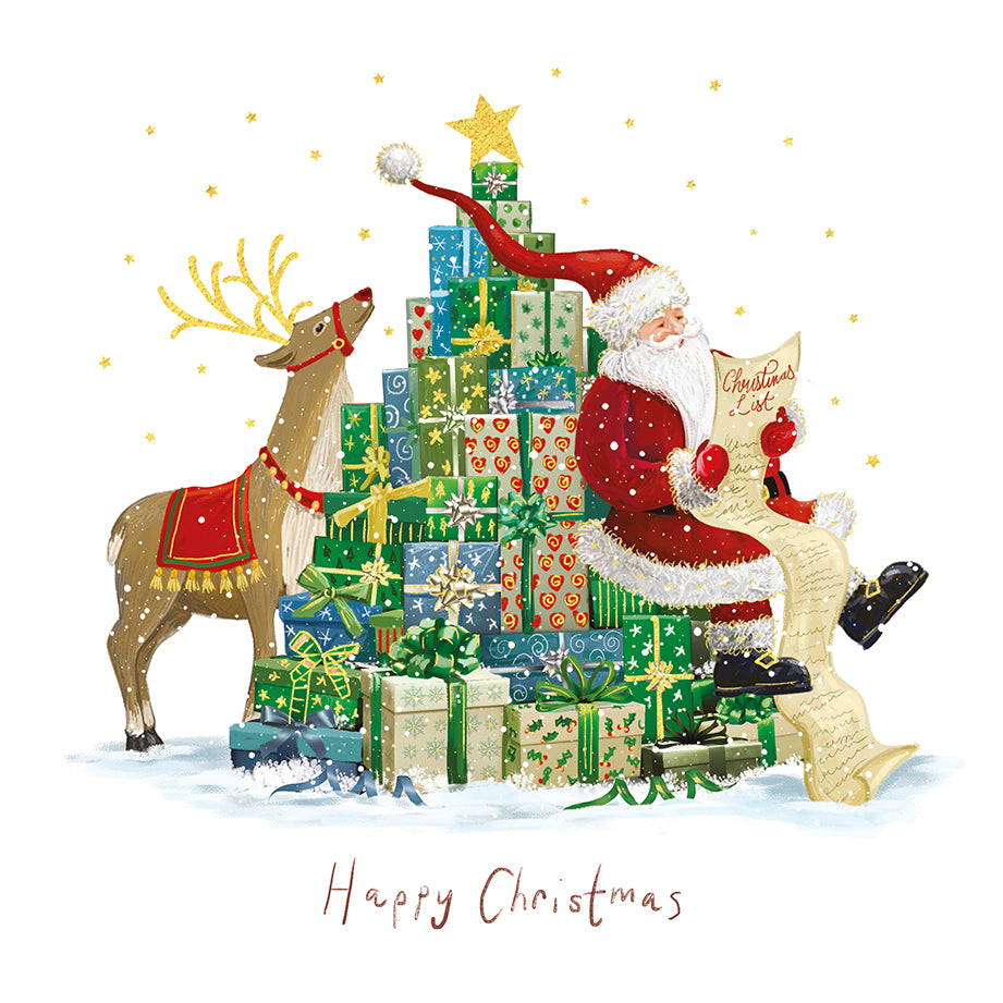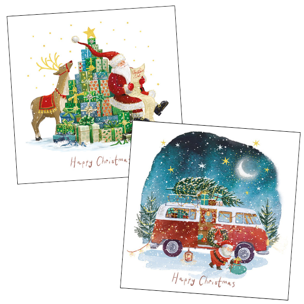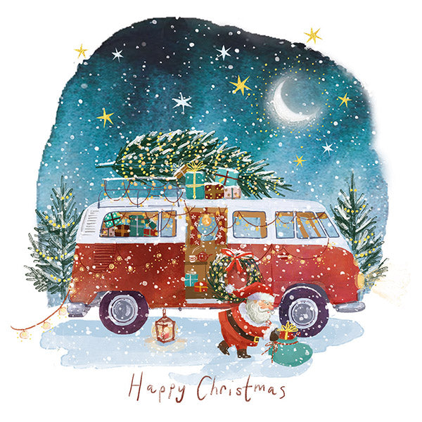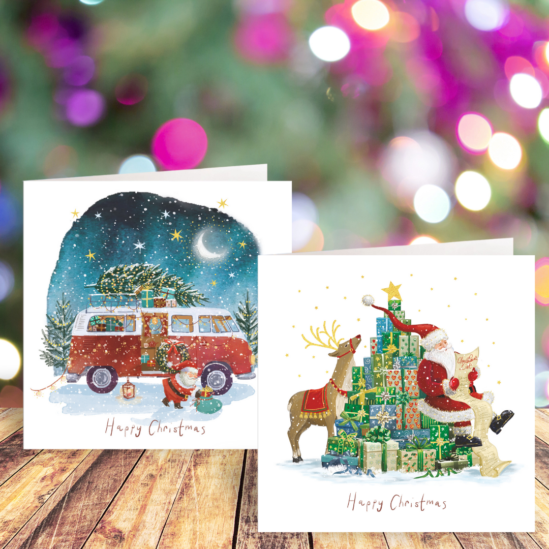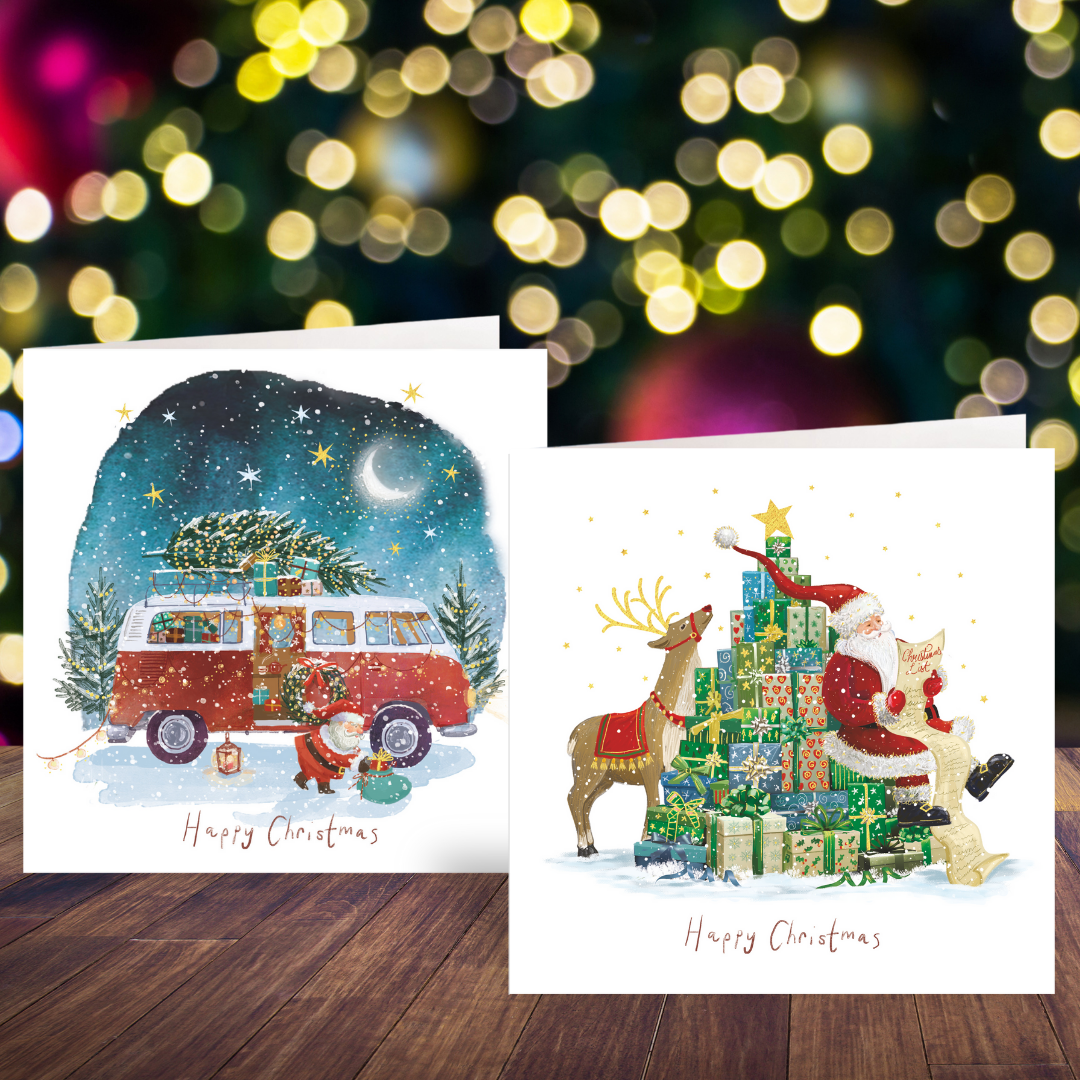 This pack of cards includes 2 design. The first features a white background with an illustration of Santa sitting on a stack of green presents shaped like a Christmas tree while he reads a Christmas list, behind him a reindeer gazes up at the star on top of the tree of presents. The second design features a watercolour snowy night time scene on a white background. The moon shines above a forest and a red campervan filled with presents with a tree tied to its roof, Santa is putting a wreath an a sack of presents into the campervan. Both designs have sparkling gold foil details, and "Merry Christmas" is written in red font at the bottom of each design. Inside both card designs, a printed message reads "Happy Christmas".