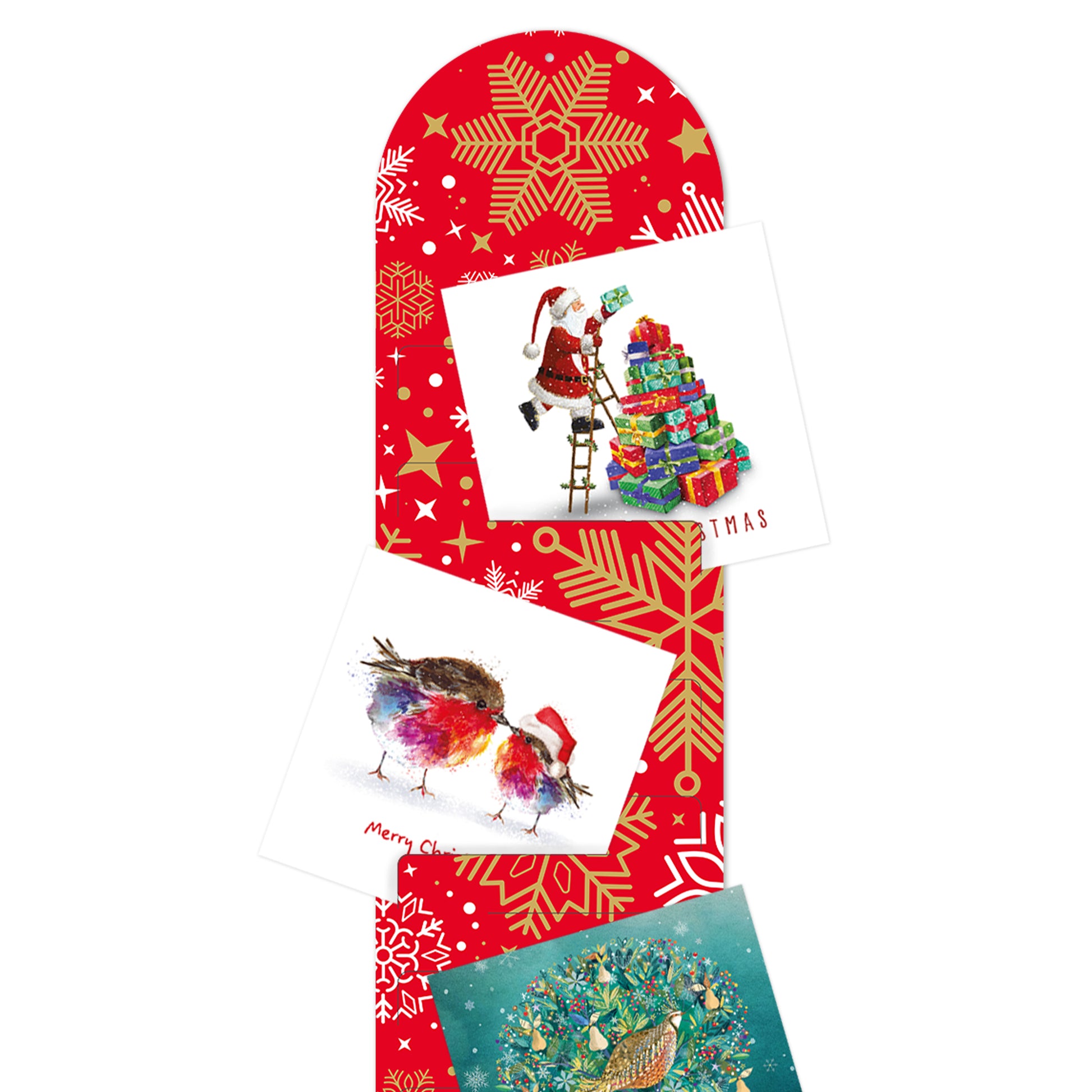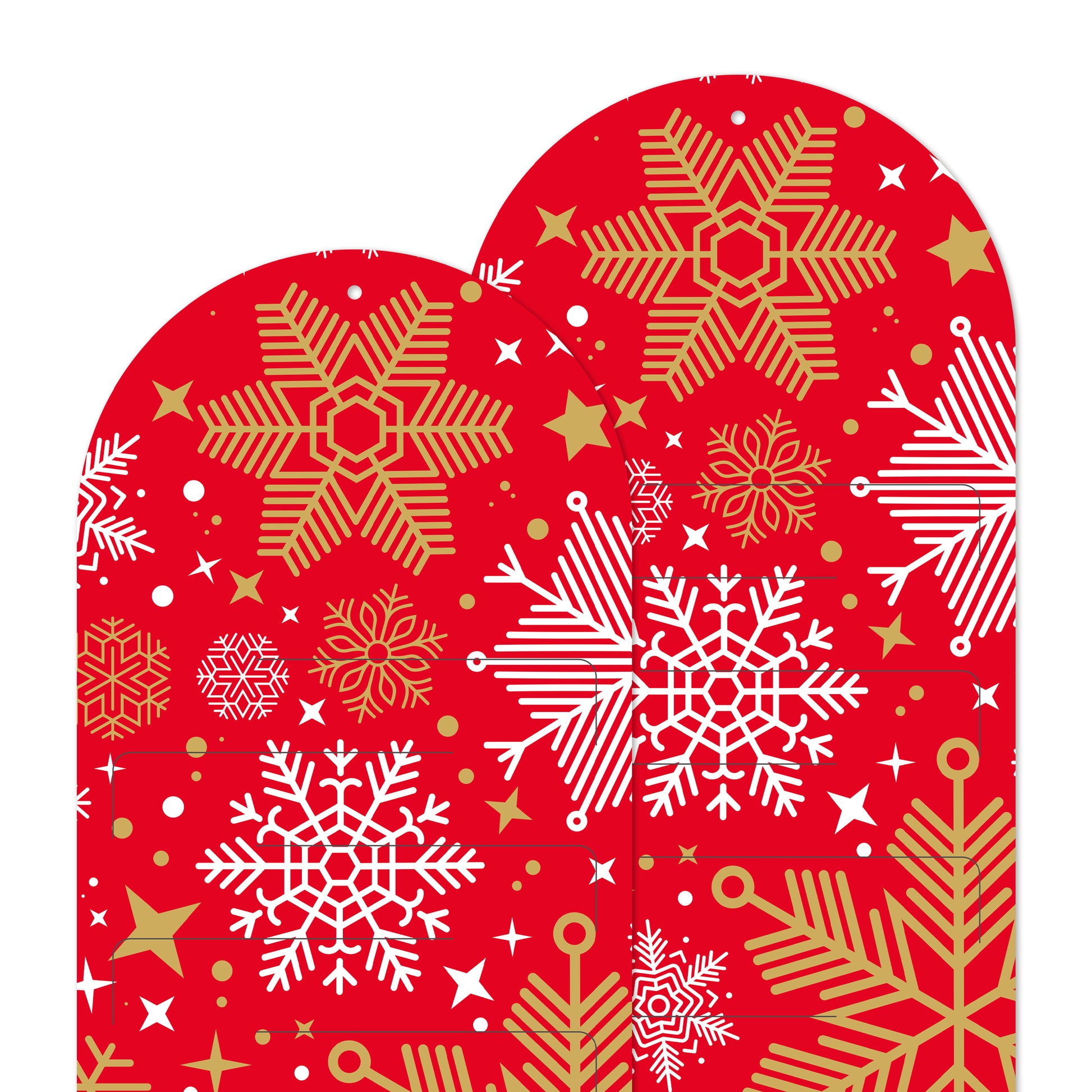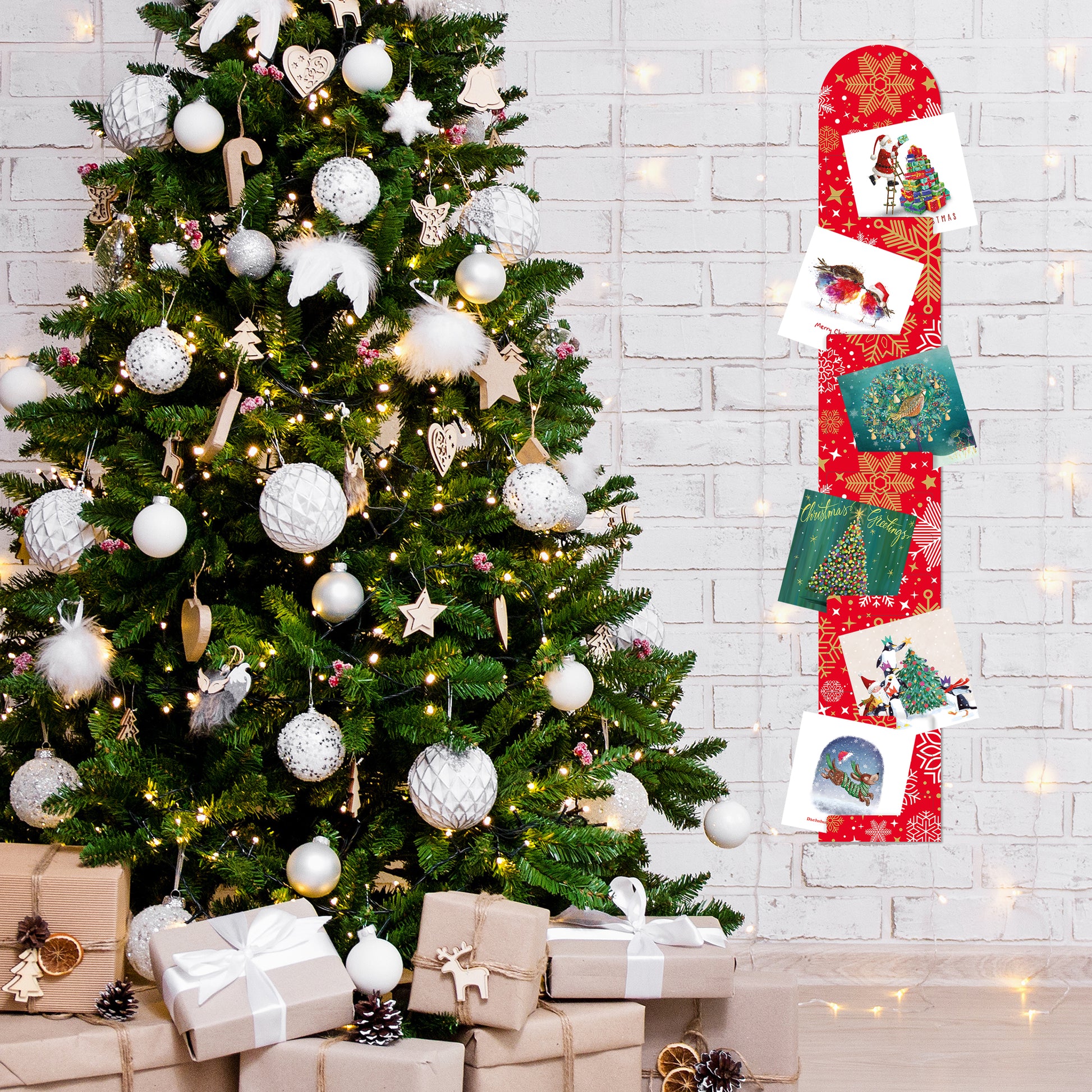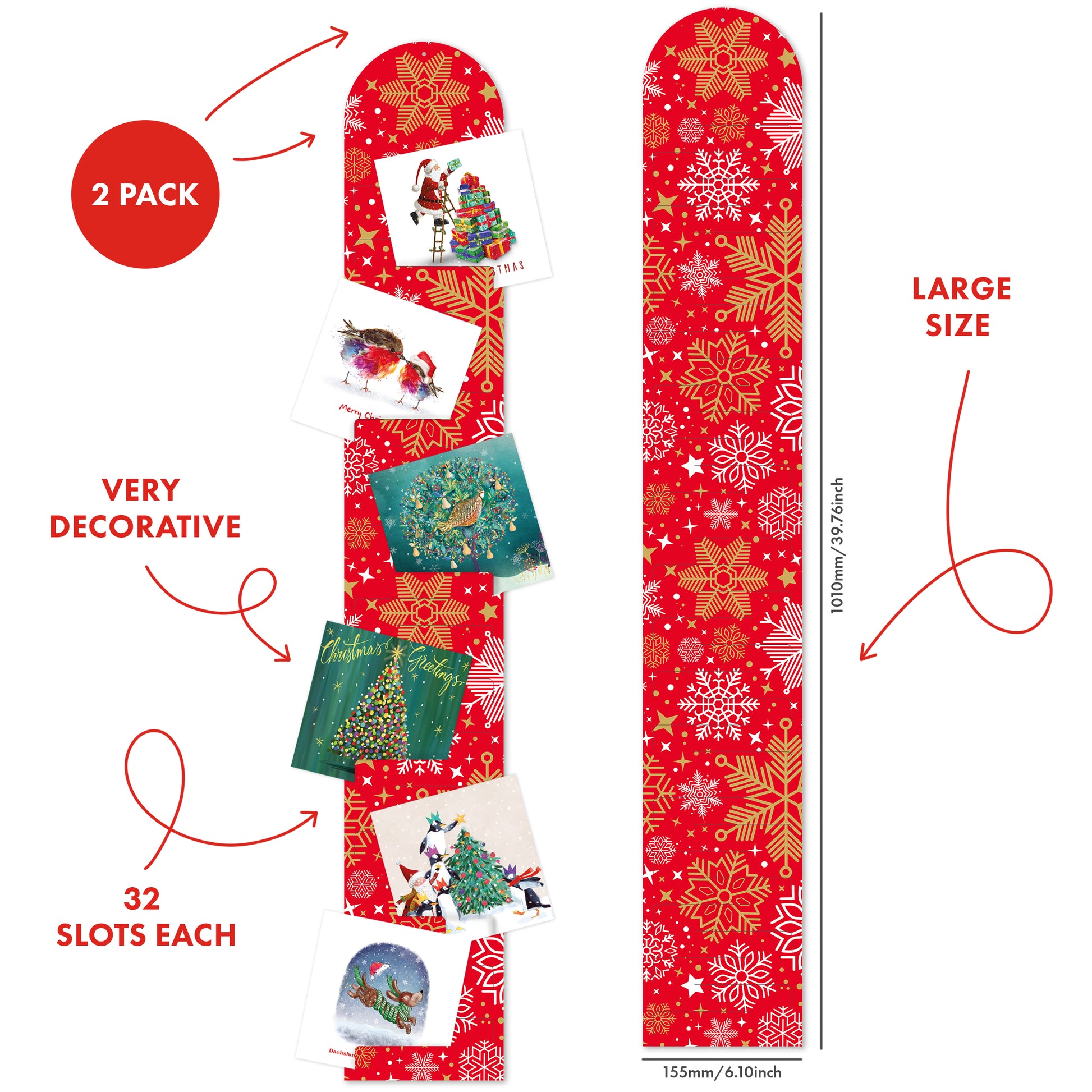 A great way to display your Christmas cards! This red card hanger features a design of white and gold snowflakes. Each pack contains 2 card hangers, with 32 slots in each hanger.