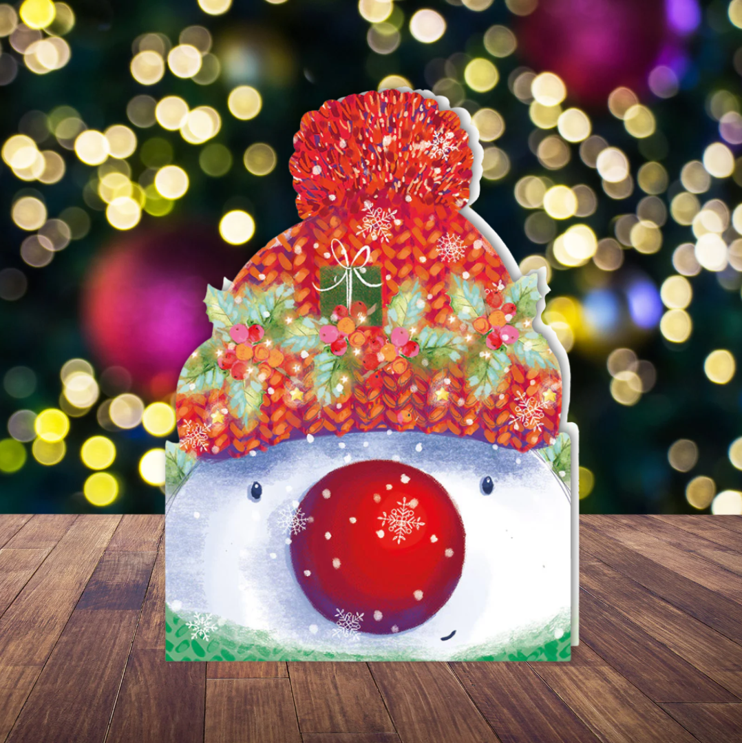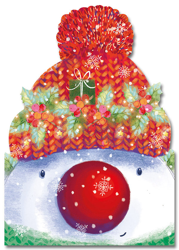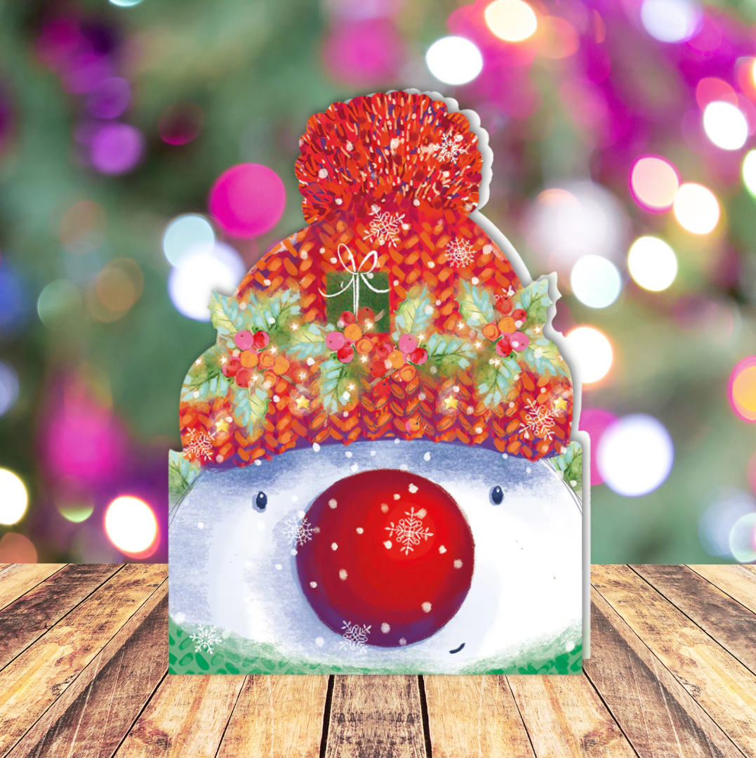 These adorable cards are die cut to the shape of a smiling snowman's face wearing a red knitted bobble hat. The snowman has a big red nose, wears a green knitted scarf, and has holly leaves and berries decorating his hat.