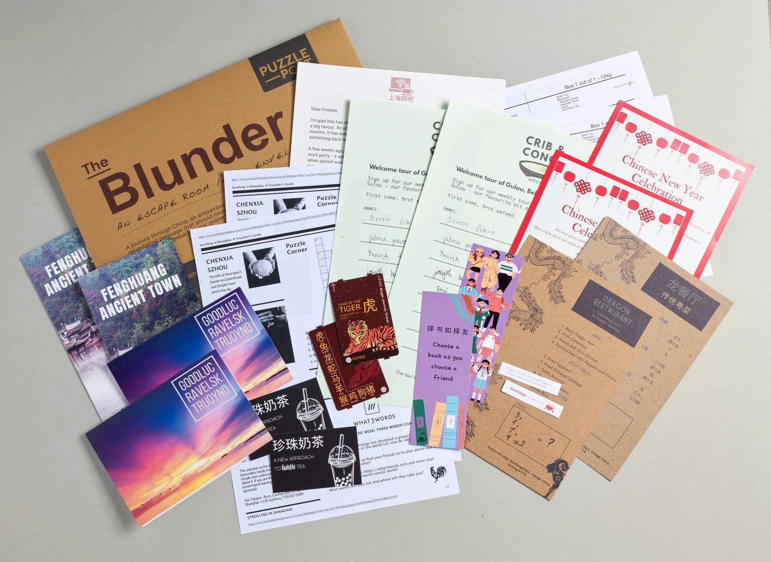 Contents: Introduction Letter; Flyer; Shipping Label; Bubble Tea Loyalty Card; Bookmark; Greeting Card; Restaurant Menu; Fortune Cookie; Shanghai News Print; Tour Signup Sheet; Metro Ticket