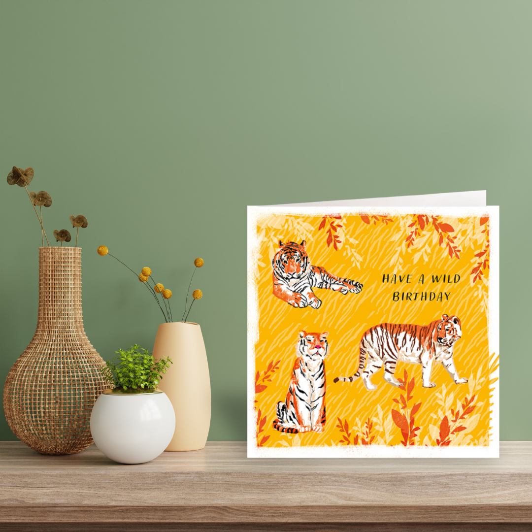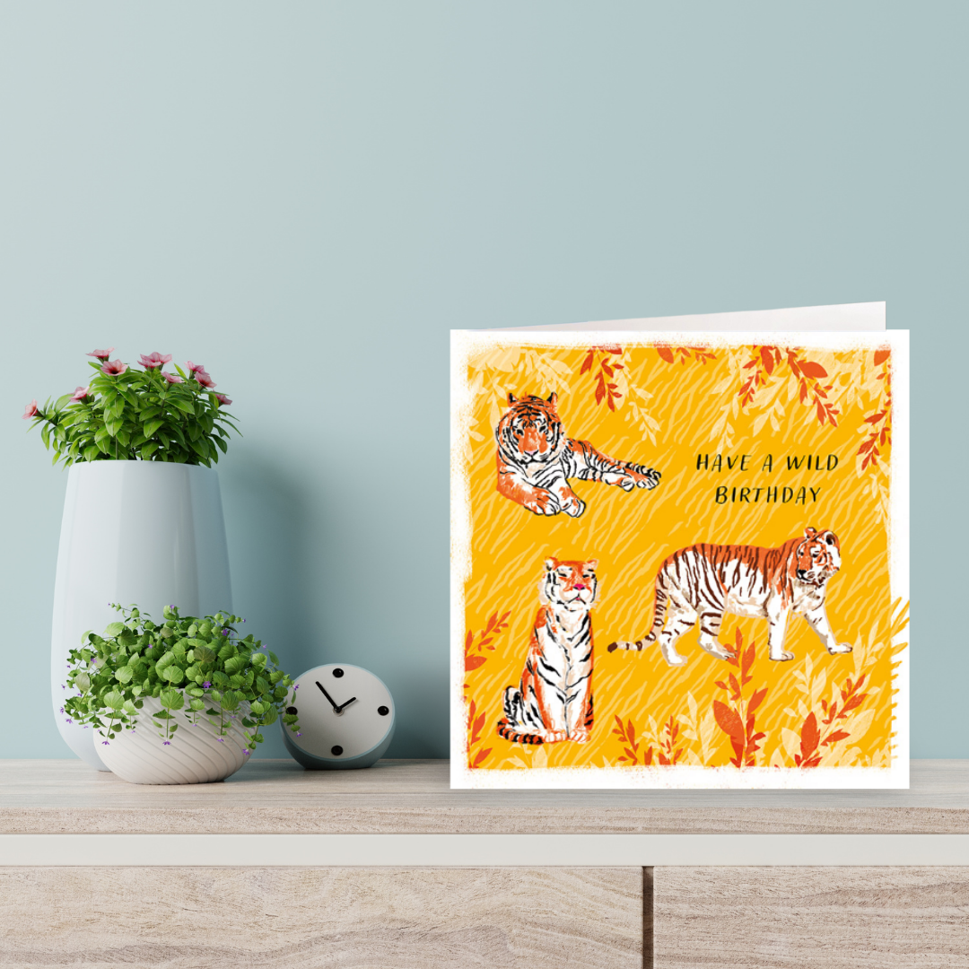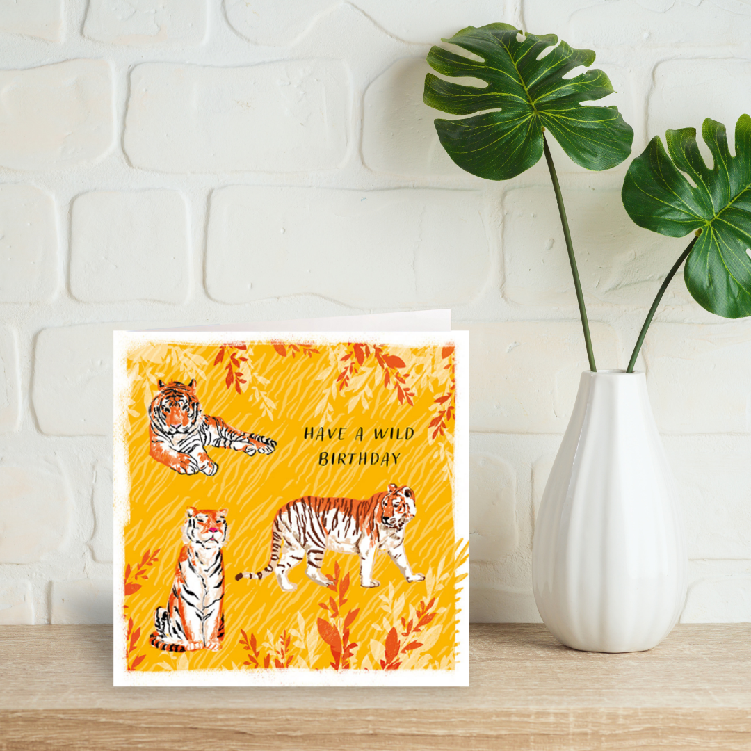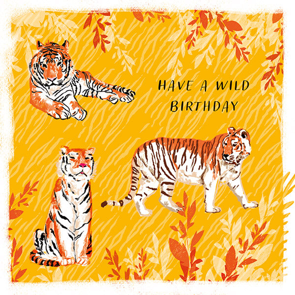 This card features three tigers on an orange background, shadows of foliage around the edges, with "have a wild birthday" written in capital letters.