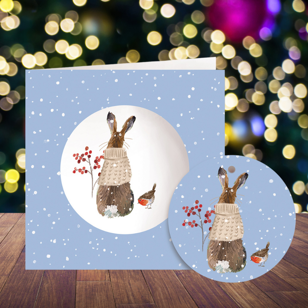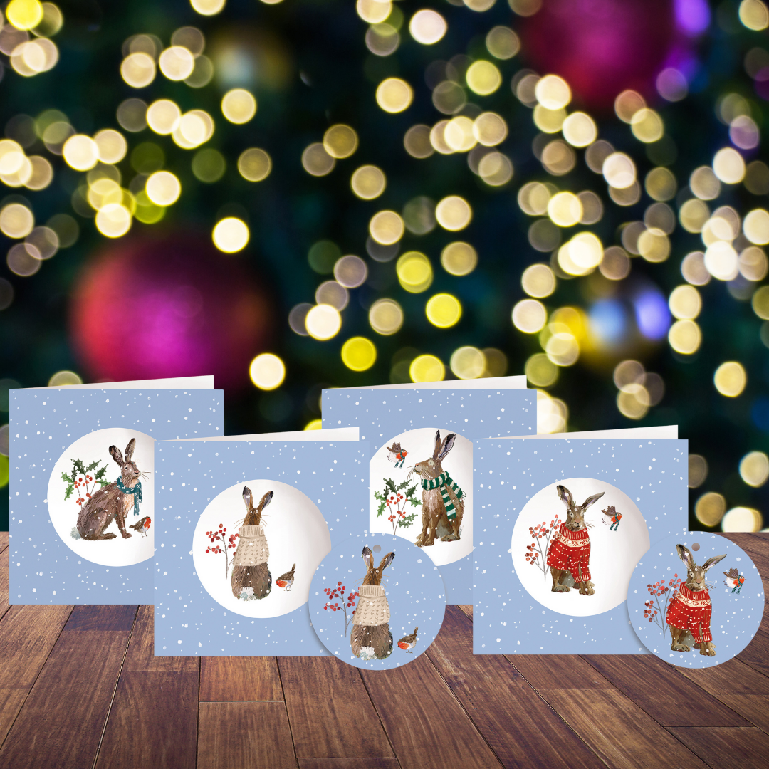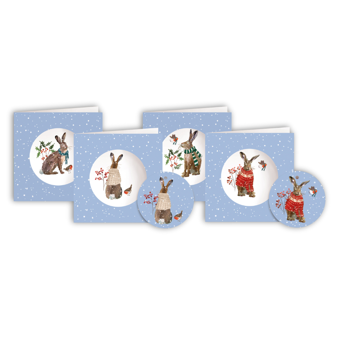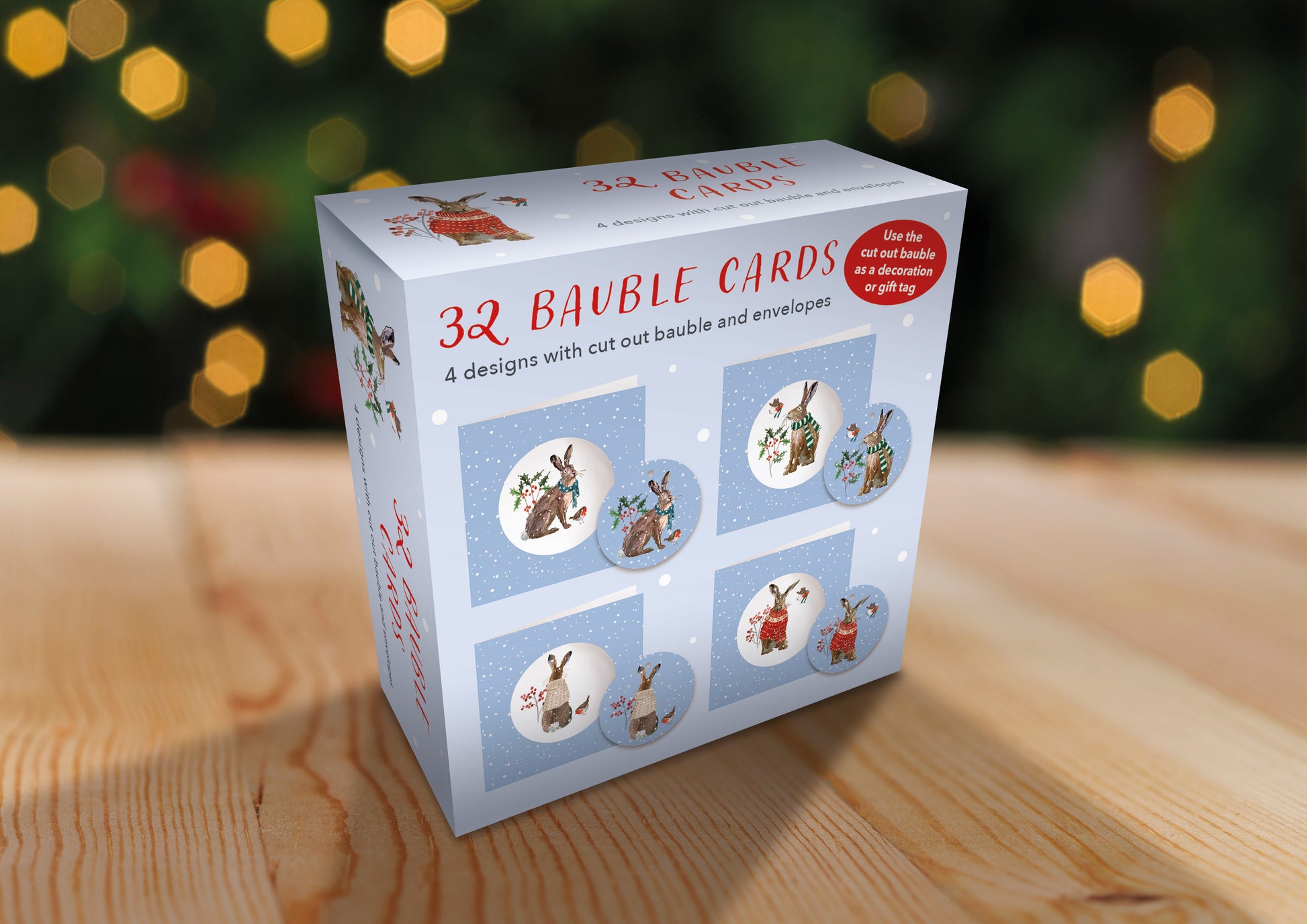 This box of 32 cards features 4 designs, each of a hare wearing a knitted jumper or scarf, with a robin and sprig of holly or branch of red berries. The illustration is printed both on a light blue background with white dots that create a falling snow effect, and on the plain white inside of the card. The cut out bauble design of the cards allows the design on the front of the card to be popped out on a circle to be used as a decoration or gift tag, leaving the illustration inside the card visible.