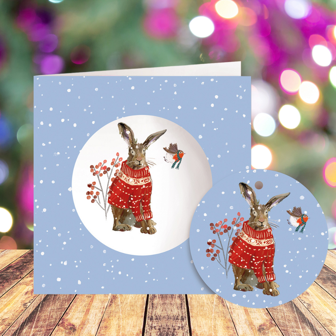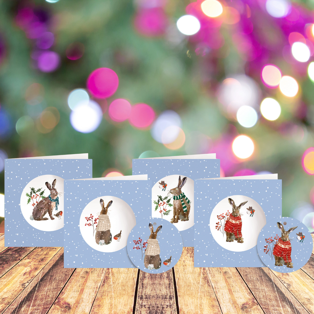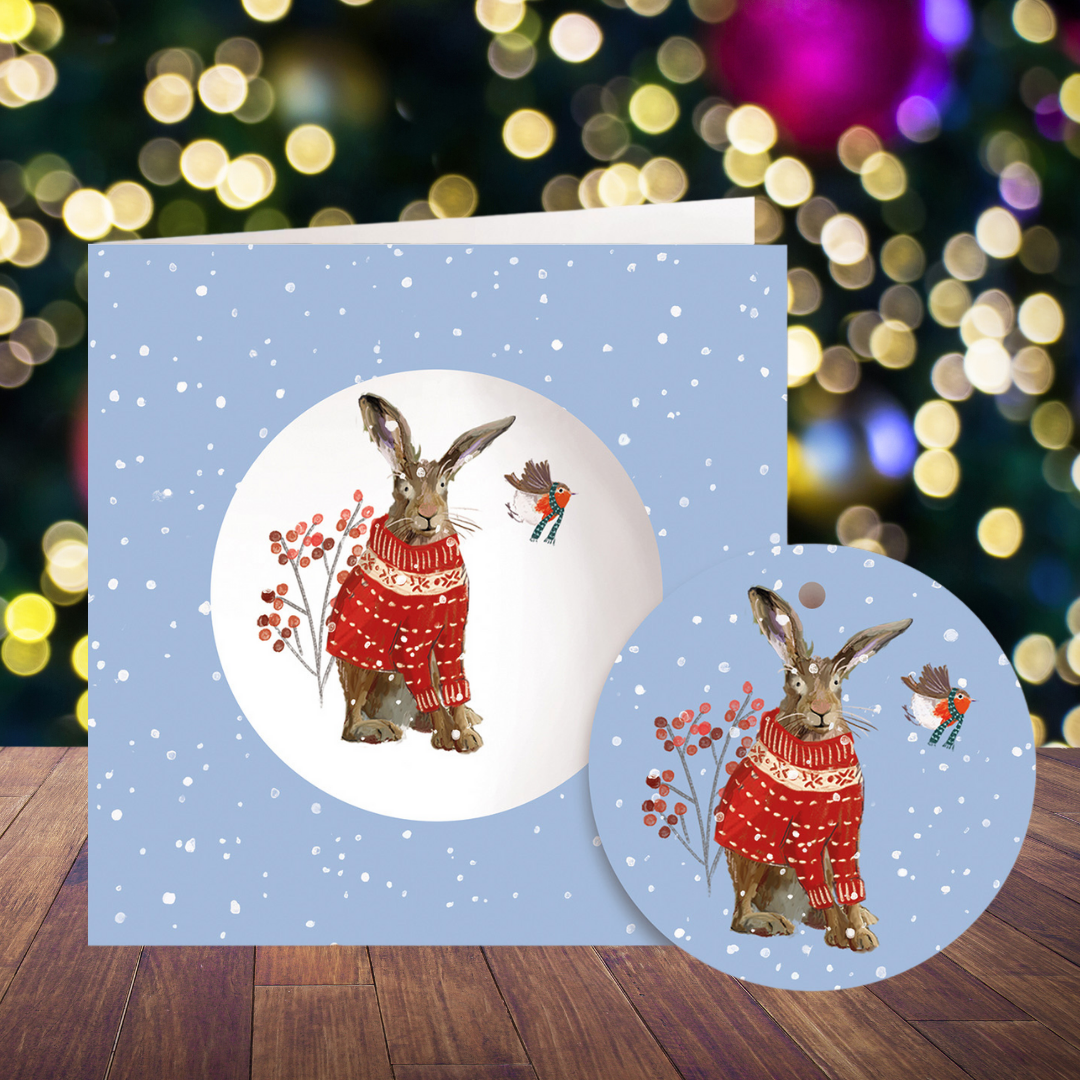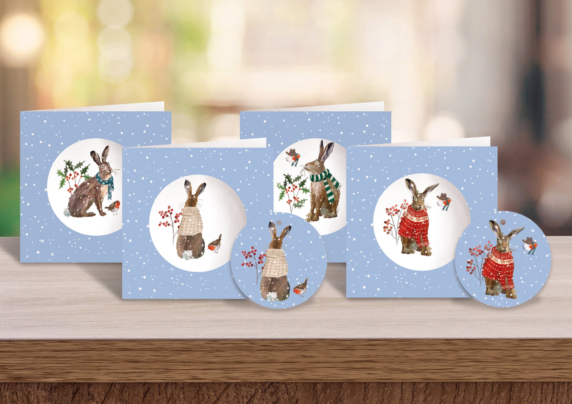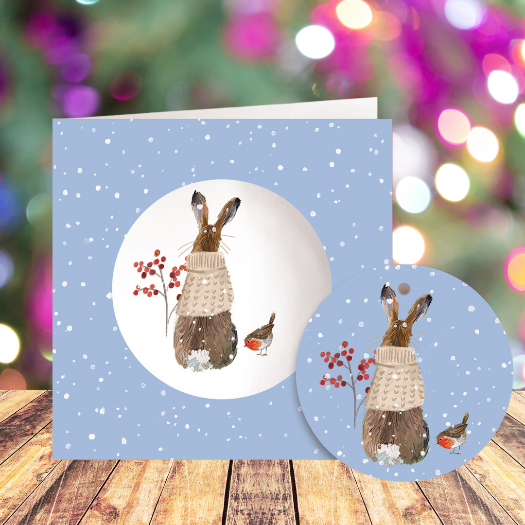 This box of 32 cards features 4 designs, each of a hare wearing a knitted jumper or scarf, with a robin and sprig of holly or branch of red berries. The illustration is printed both on a light blue background with white dots that create a falling snow effect, and on the plain white inside of the card. The cut out bauble design of the cards allows the design on the front of the card to be popped out on a circle to be used as a decoration or gift tag, leaving the illustration inside the card visible.